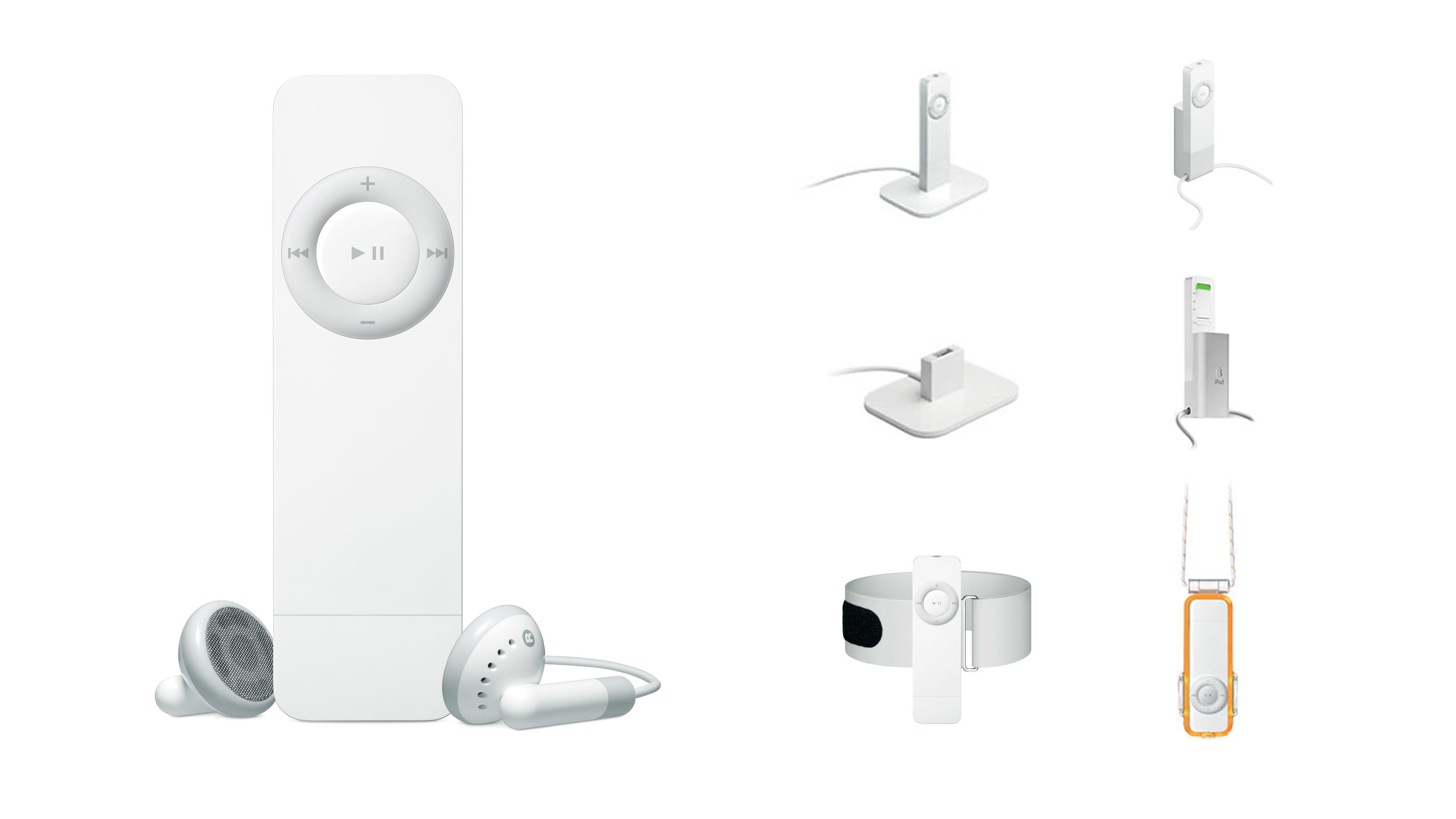 V roce 2005 se dal iPod shuffle prakticky sám o sobě považovat za doplněk. Apple ale usoudil, že i k doplňku jsou zapotřebí další doplňky, a tak k němu vydal několik překvapivě užitečných kousků příslušenství, jako byl pásek pro připevnění na paži nebo dock pro nabíjení.