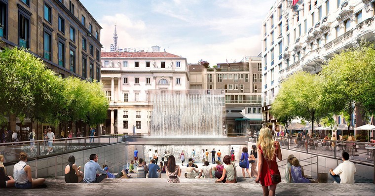 V porovnání s ostatními Apple Story se bude zrovna ten v Miláně pyšnit veřejným prostorem, respektive náměstím, na němž se začnou setkávat lidé. Dominantou náměstí, které bude vybízet k odpočinku a setkání s přáteli, se stane připravovaná fontána.