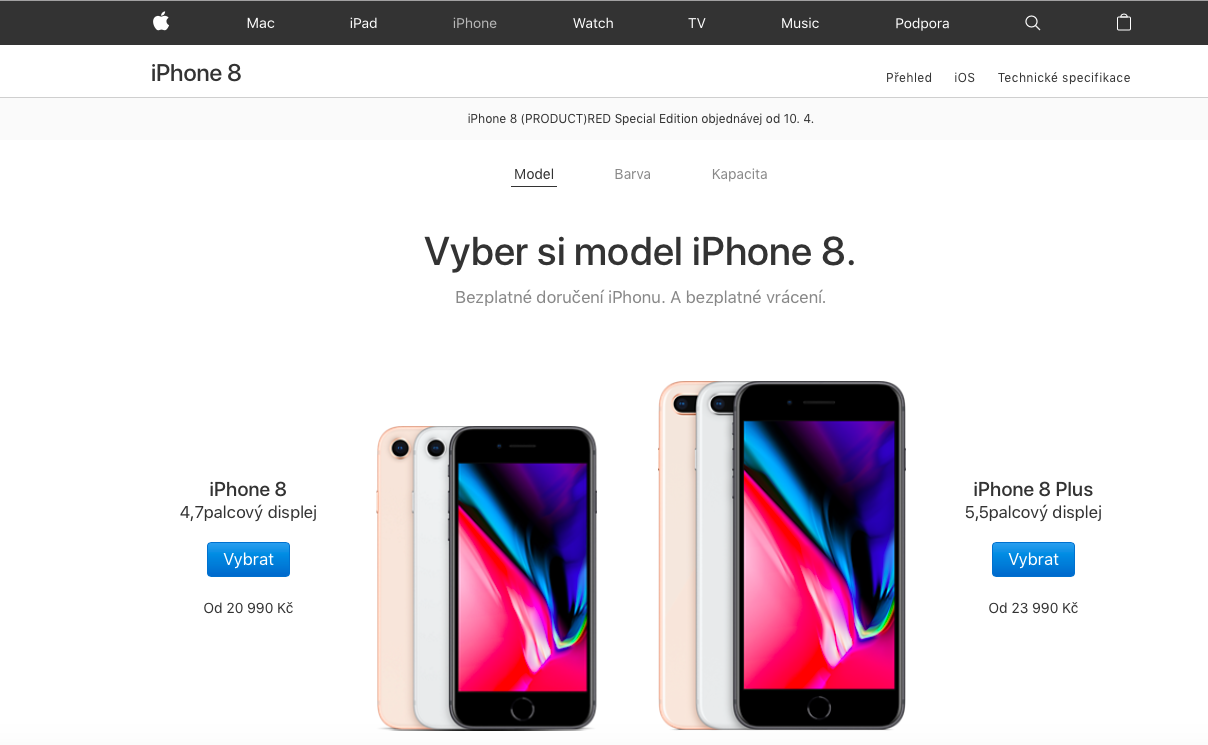 Vraťme se ale zpět k novým iPhonům. Ty bude Apple nabízet jak v 64GB, tak i ve 256GB variantě, přičemž cena odstartuje na 699 dolarech a bude s tou, za kterou Apple prodává své loňské iPhony 8 a 8 Plus, shodná. V České republice by tak měl (PRODUCT) RED iPhone začínat na 20 990 korunách. Objednávky by na něj měl Apple začít přijímat již zítra, tedy 10.4. Minimálně screenshot, který se nám podařil zachytit před pádem webu Applu (který při psaní tohoto článku přetrvával) tomu nasvědčuje. Co se však týče doručení, o tom zatím bohužel příliš informací nemáme. Apple totiž ve své tiskové zprávě Českou republiku ani Slovensko nezmiňuje, ale pravděpodobně je zařadil do “dalších zemí”, které se červených iPhonů dočkají později v dubnu. První šťastlivci v zahraniční by se pak měli dočkat svého červeného krasavce již 13. dubna.