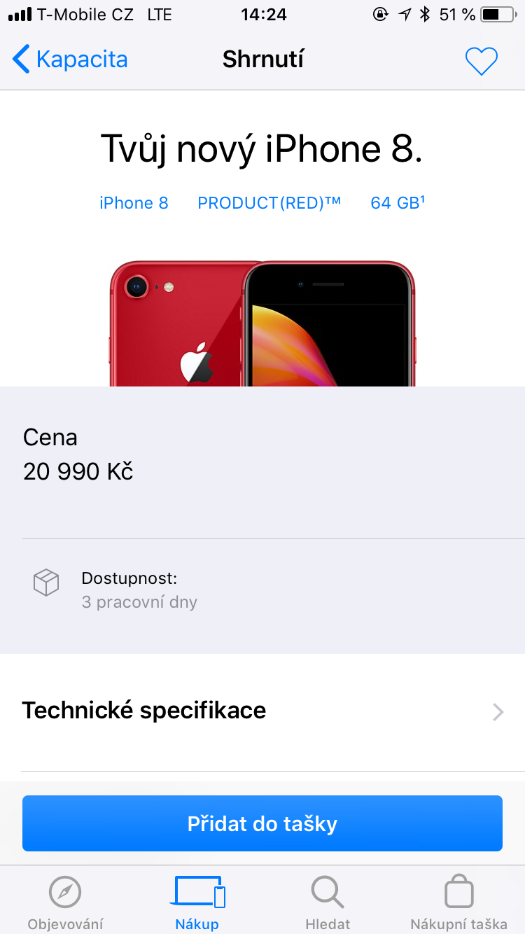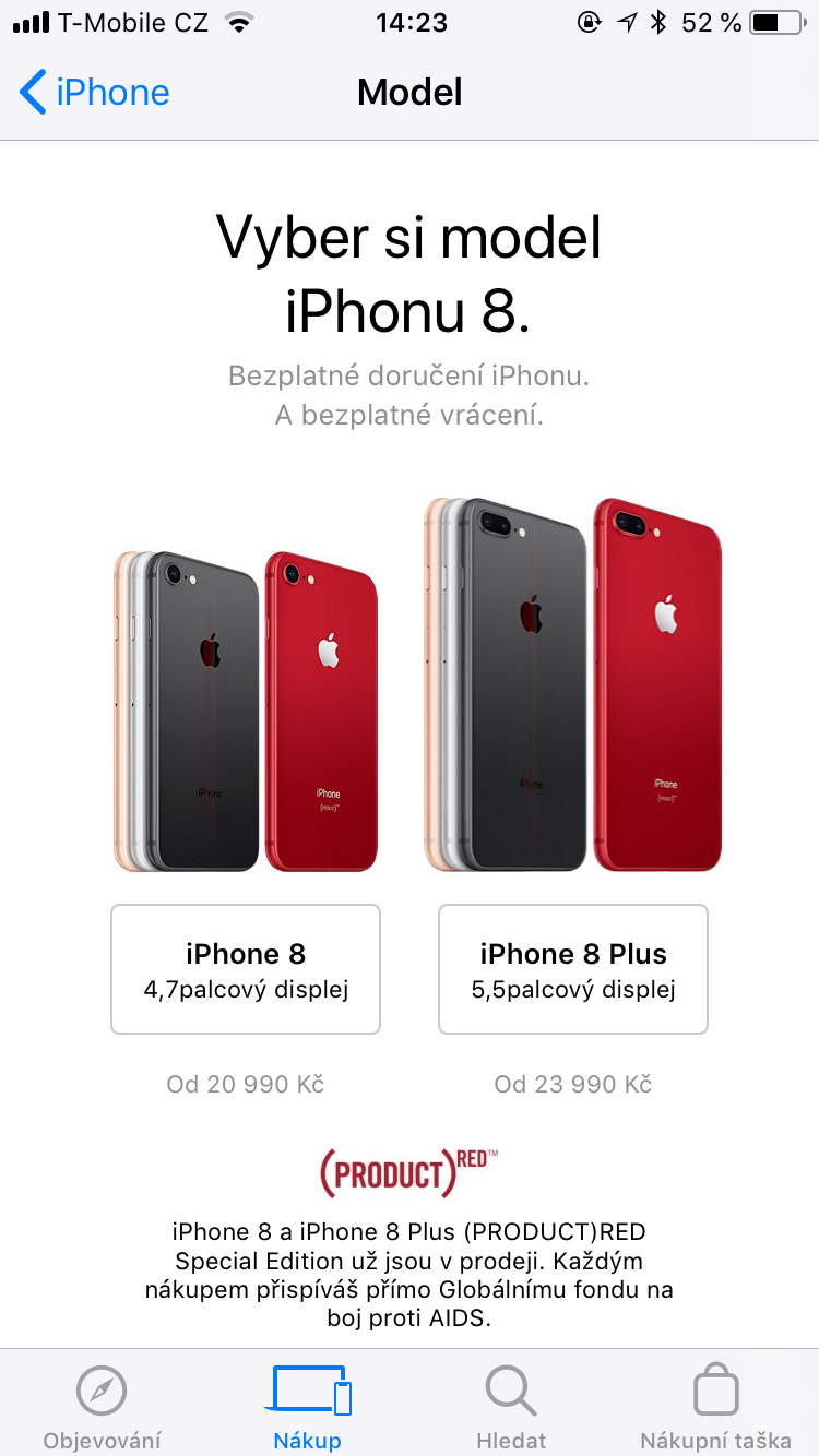 Pokud se dnes rozhodnete nový iPhone 8 či 8 Plus v červené variantě zakoupit, Apple vám jej alespoň podle svých stránek doručí do tří pracovních dnů, což je velmi slušné. Tím spíš, když Česká republika v seznamu zemí v první vlně nefigurovala. Co se pak týká samotných iPhonů, ty si můžete zakoupit jak v 64GB, tak i ve větší 256GB variantě. Jejich cena začíná na 20 990 korunách u menšího 4,7” iPhone 8 s kapacitou 64 GB, za větší kapacitu pak zaplatíte u tohoto modelu 25 490 korun. Větší “Plusko” vás pak vyjde na 23 990 korun v menší 64 GB verzi a 28 490 korun ve větší 256 GB verzi. Jak tedy můžete vidět, ceny červeného iPhonu se od jeho bratříčků představených v září vůbec neliší.