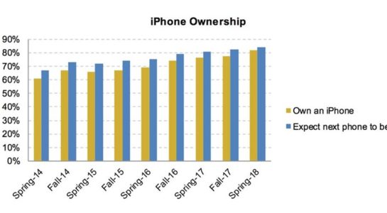 Počet vzrost o čtyři procentní body od posledního výzkumu na podzim loňského roku a zdá se, že čísla i dále porostou. 84% dotázaných uvedlo, že jejich příští telefon bude iPhone. Analytici Piper Jaffray očekávají tenhle nárust na podzim, kdy Apple zřejmě vydá tři nové iPhony. Právě 6,1“ verze má jistě lákat cenovkou i americkou mládež.