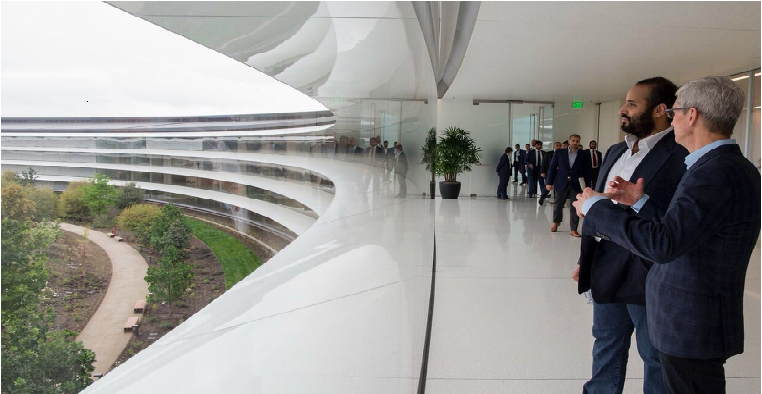 Tim Cook prince provedl velkou částí nově vybudovaného komplexu a v závěru prohlídky si Apple pro vzácnou návštěvu připravil speciální prezentaci v Divadle Steva Jobse, která pojednávala o hlasových aplikacích. Arabský princ tak zasedl na místa, na kterých seděli novináři při představení revolučního iPhonu X před více než půl rokem.