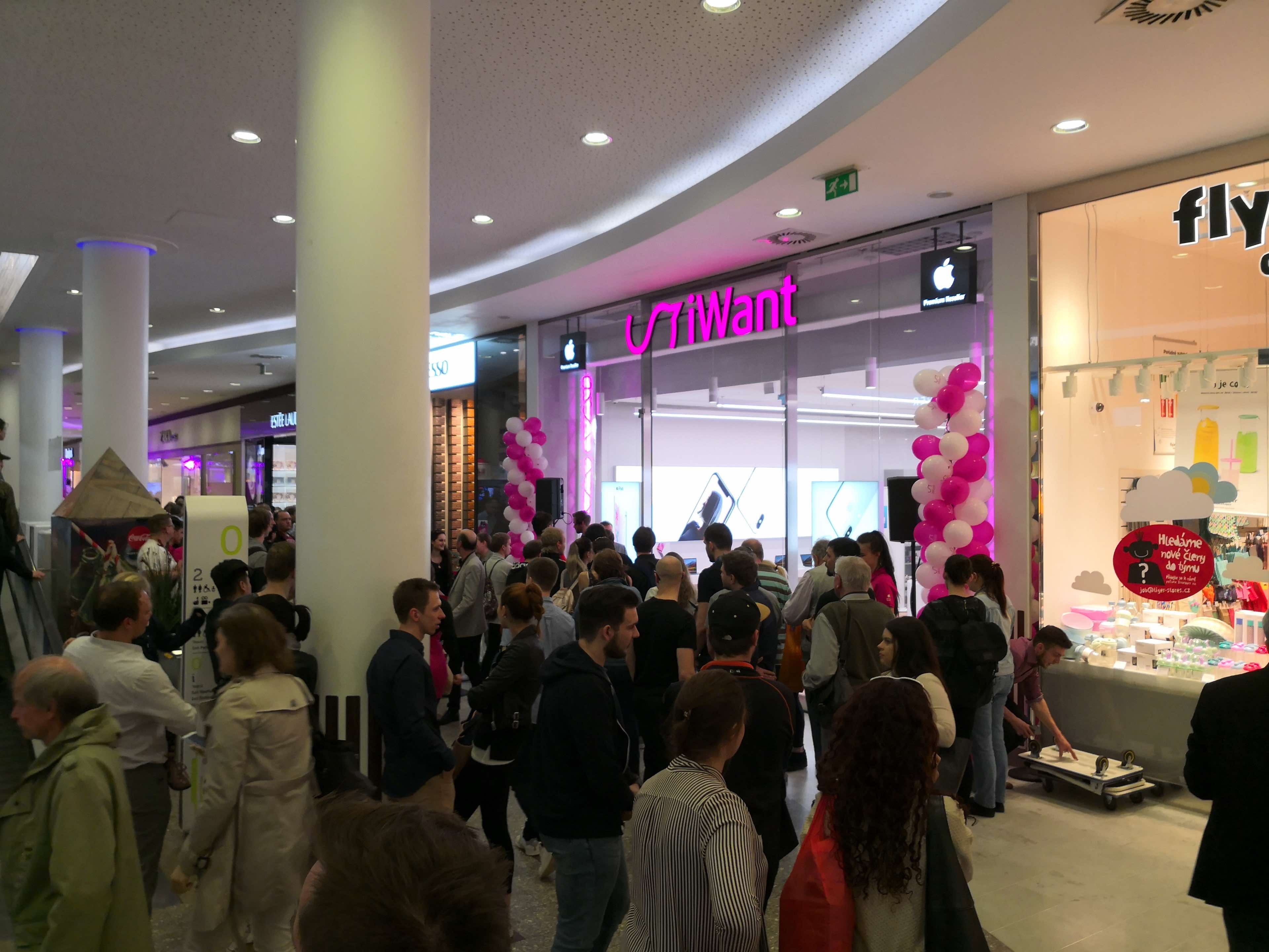 iWant svoji novou prodejnu usídlil prakticky jen kousek od hlavního vchodu, konkrétně hned za prodejnu Flying Tiger, a tak pro návštěvníky nebylo složité ji najít. Právě snadná dostupnost se svým způsobem podepsala i na hojné účasti, protože už několik desítek minut před slavnostním otevřením stál před prodejnou početný zástup lidí. Návštěvníky nalákaly nejenom zajímavé slevy, ale především pak soutěž o víkendový zájezd do Londýna pro dvě osoby a také slosování o nové Apple Watch, do kterého se zařadil každý, kdo se vyfotil v iWant foto koutku za použití mnoha rekvizit.