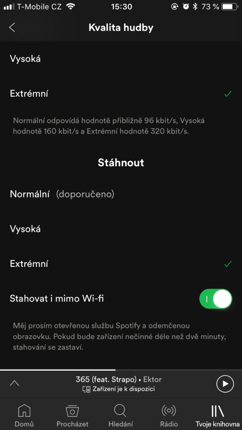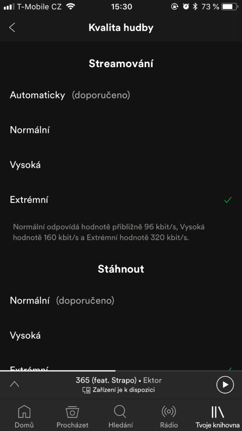 Pokud vás tato možnost zaujala, jako první krok samozřejmě musíme spustit aplikaci Spotify. V pravém dolním rohu klikneme v menu na možnost Tvoje knihovna. Poté v pravém horním rohu tapneme na ikonku ozubeného kolečka, která nás přesměruje do nastavení. V nabídce, která se zobrazí, rozklikneme možnost Kvalita hudby. Po zobrazení možností už si jednoduše můžete vybrat, v jaké kvalitě se vám bude hudba přehrávat při streamování a poté, co si ji stáhnete do zařízení. Osobně mám na obou těchto nastaveních zvolenou možnost Extrémní, protože si jednak rád poslechnu kvalitní zvuk a jednak mám takřka neomezená mobilní data.