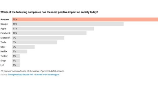 Před nedávnem provedly společnosti Recode a SurveyMonkey průzkum, jehož cílem je ukázat, jaké technologické firmy mají podle amerických občanů nejpozitivnější vliv na společnost. V rámci průzkumu byla respondentům položena otázka: „Která z následujících firem má v současné době nejpozitivnější dopad na společnost?“