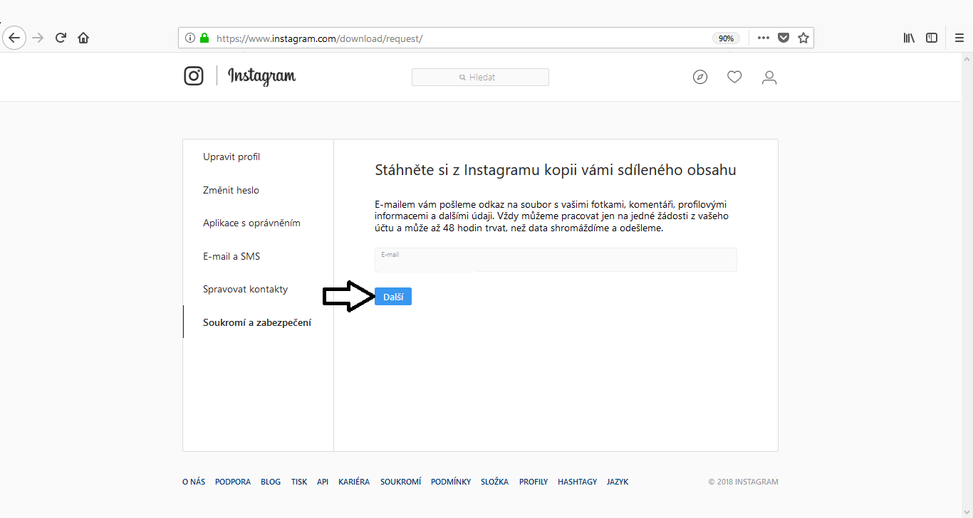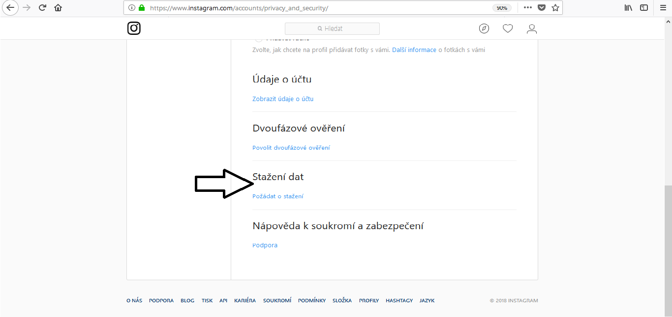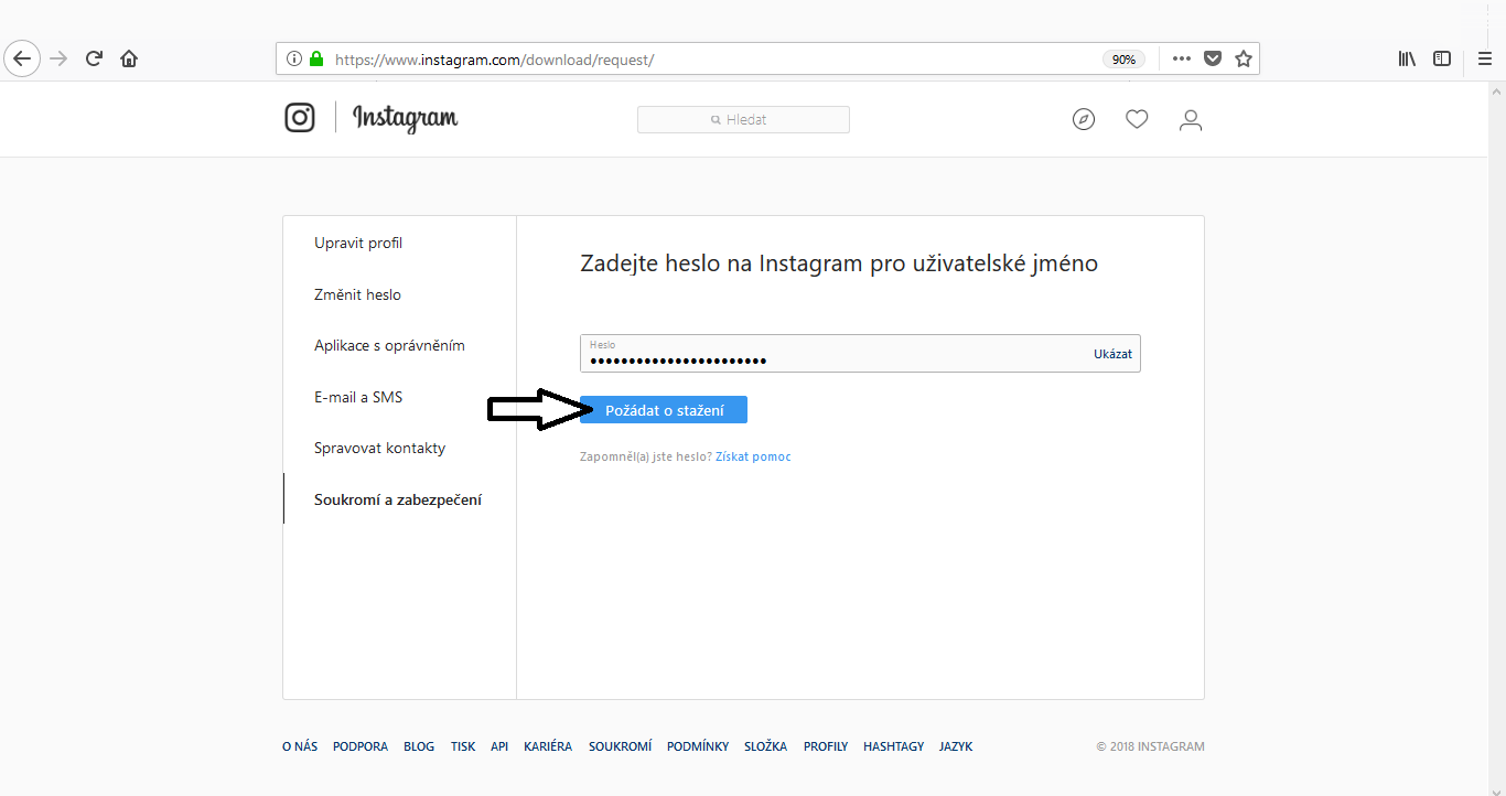 Jak si stáhnete z Instagramu Vaše osobní údaje? Ve svém instagramovém profilu na webu či v aplikaci klikněte na Upravit profil, zde vyberte Soukromí a zabezpečení, scrollujte dolů na položku Stažení dat, zadejte heslo ke svému účtu a potvrďte jej. Do 48 hodin Vám Instagram pošle na registrační email zprávu s podrobným výpisem.
