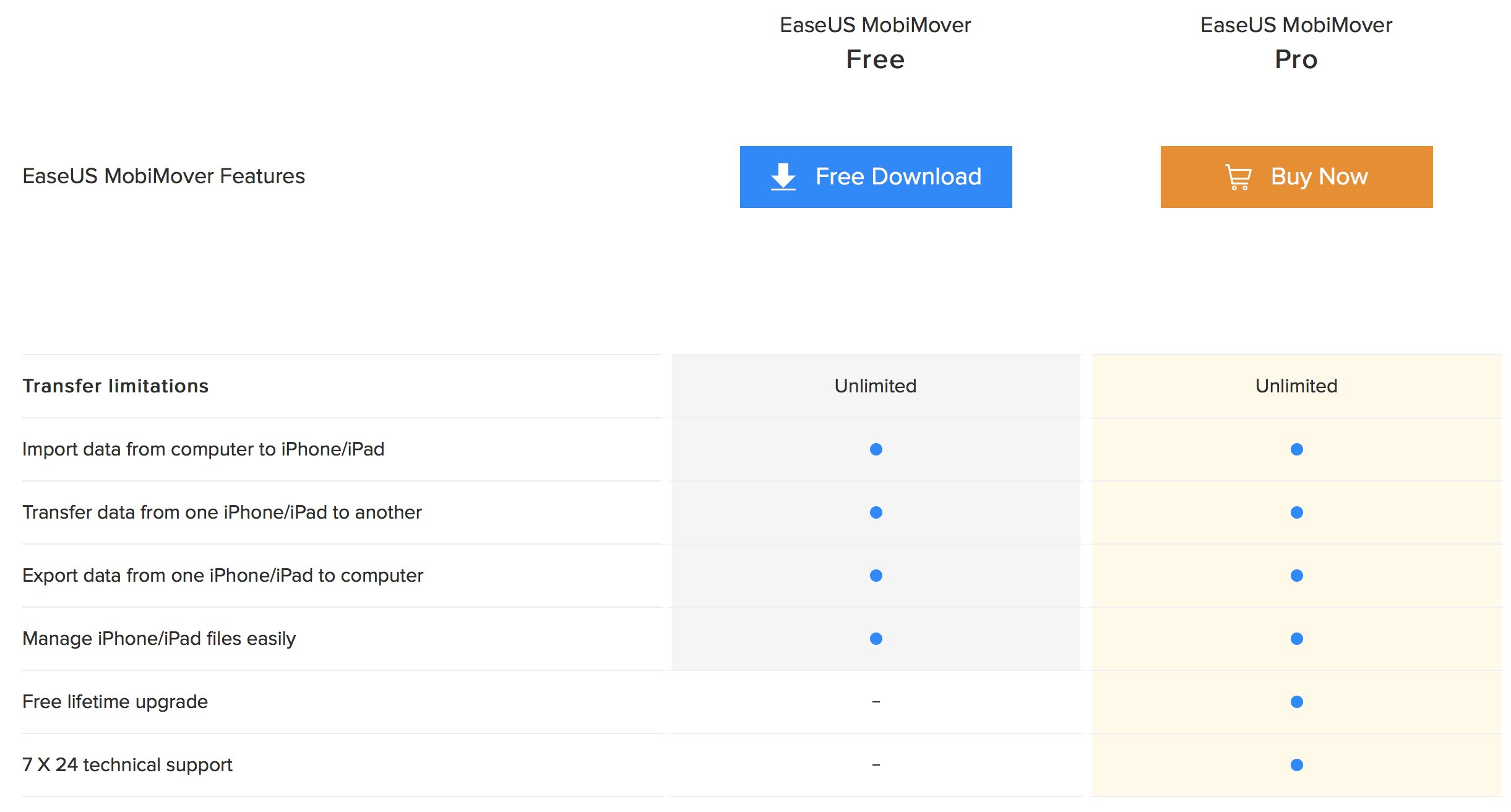 MobiMover od EaseUS je doopravdy zdarma. Jak jsem zmínil už výše, můžete si samozřejmě koupit Pro verzi, ale jediné, co získáte navíc, je 24/7 podpora a doživotní aktualizace programu. Na tabulku porovnání obou verzí se můžete podívat níže.