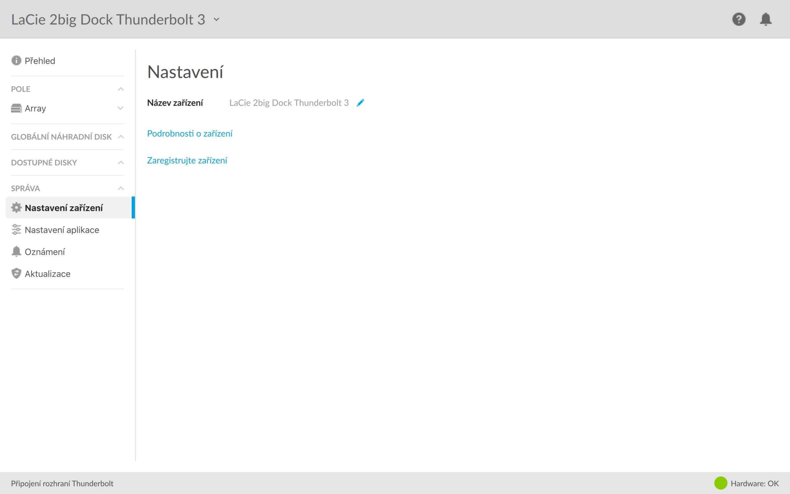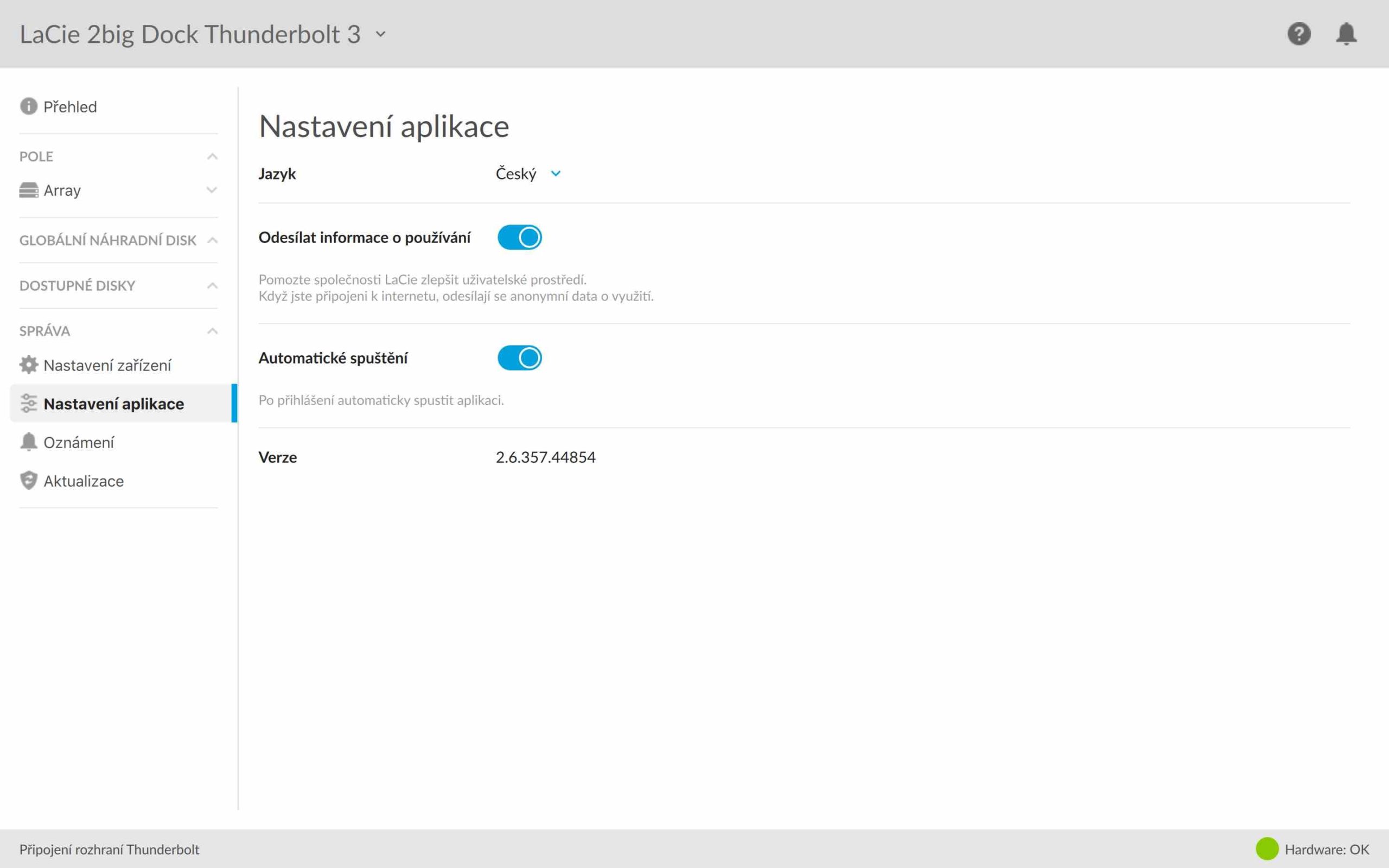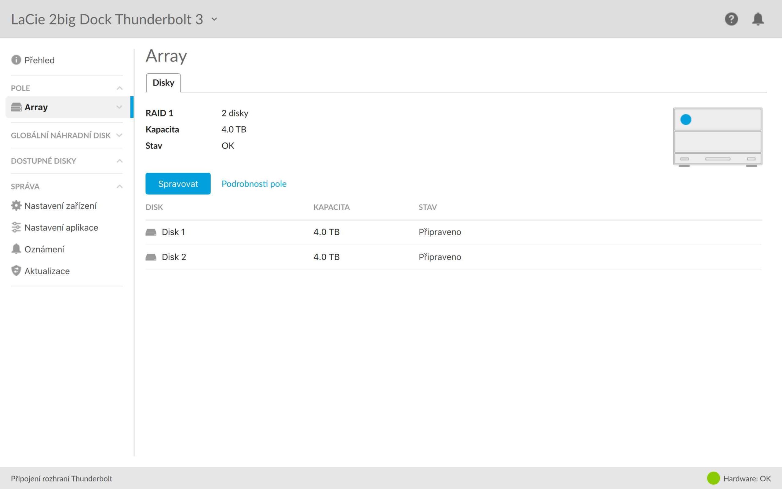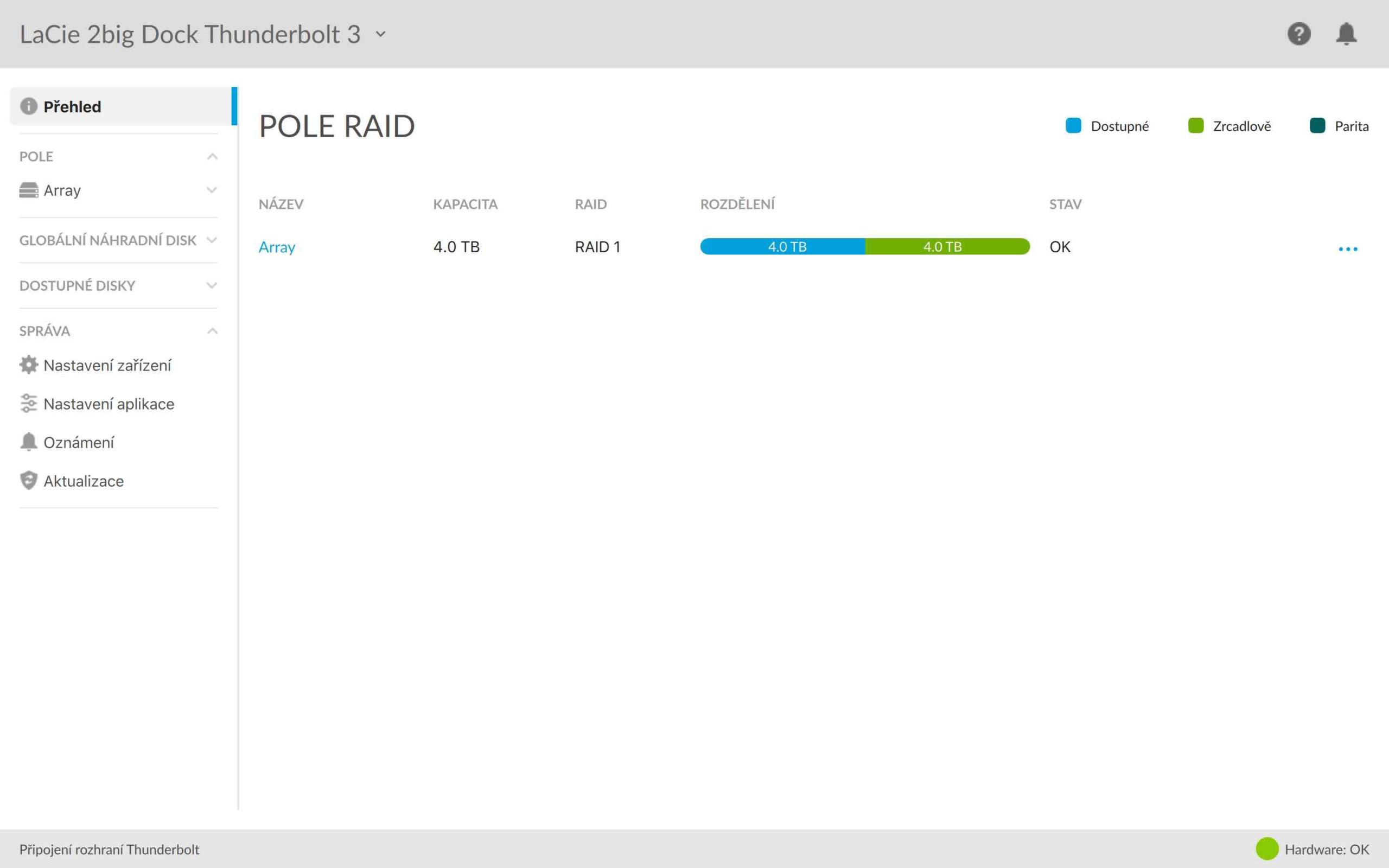 Konfigurace RAID režimů se provádí skrze aplikaci LaCie RAID Manager, která je volně dostupná na macOS i Windows. Samotná správa je jednoduchá a zvládne ji i méně zkušený uživatel. Kromě toho lze skrze aplikaci aktualizovat firmware zařízení nebo si o něm zobrazit většinu informací. Dostupná jsou i oznámení, která si můžete nechat zasílat na e-mail a mít tak přehled, kdyby se s úložištěm cokoli dělo v době vaší nepřítomnosti.