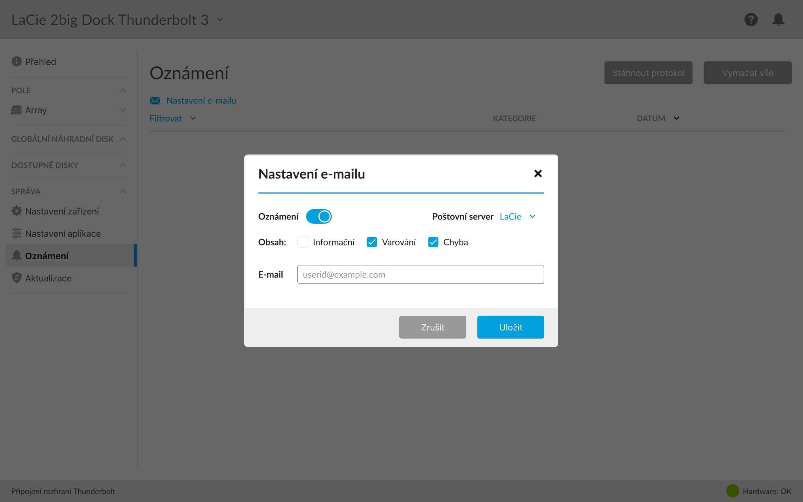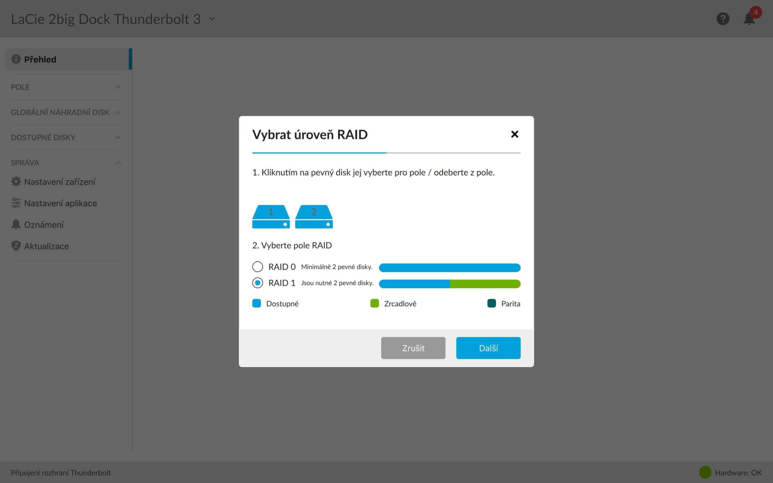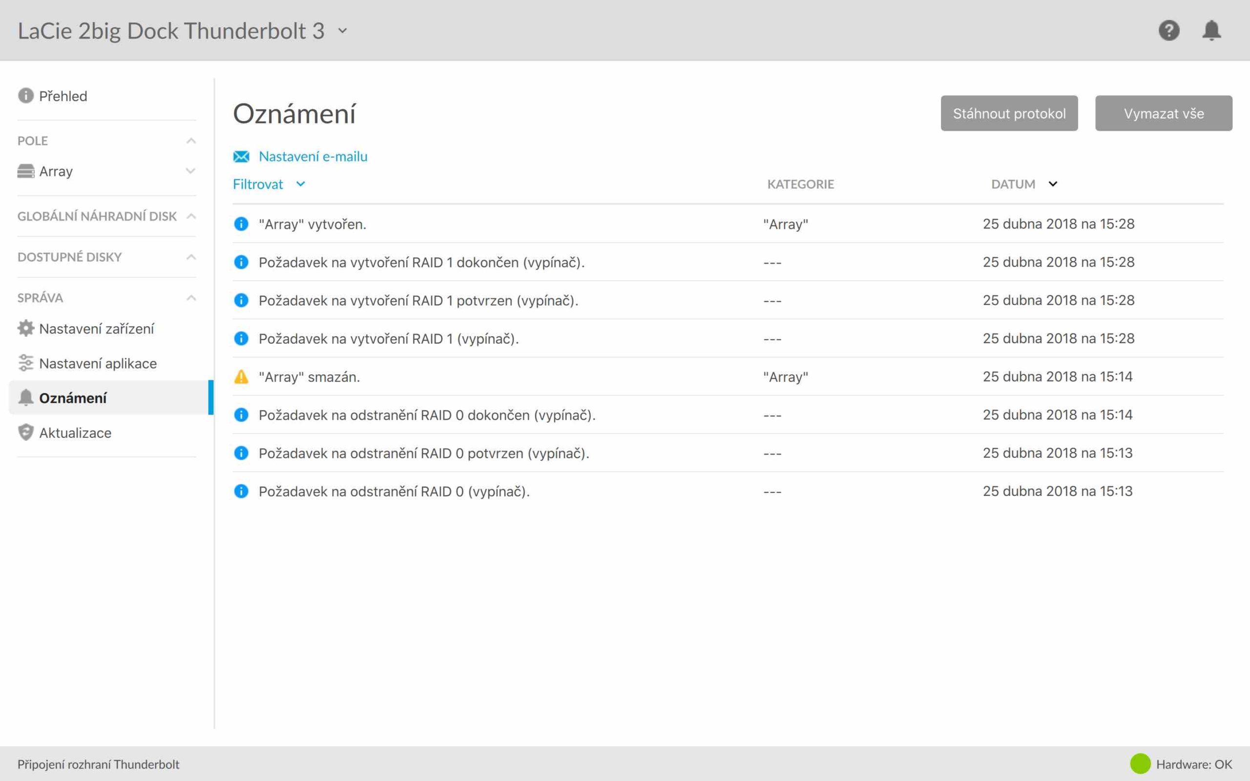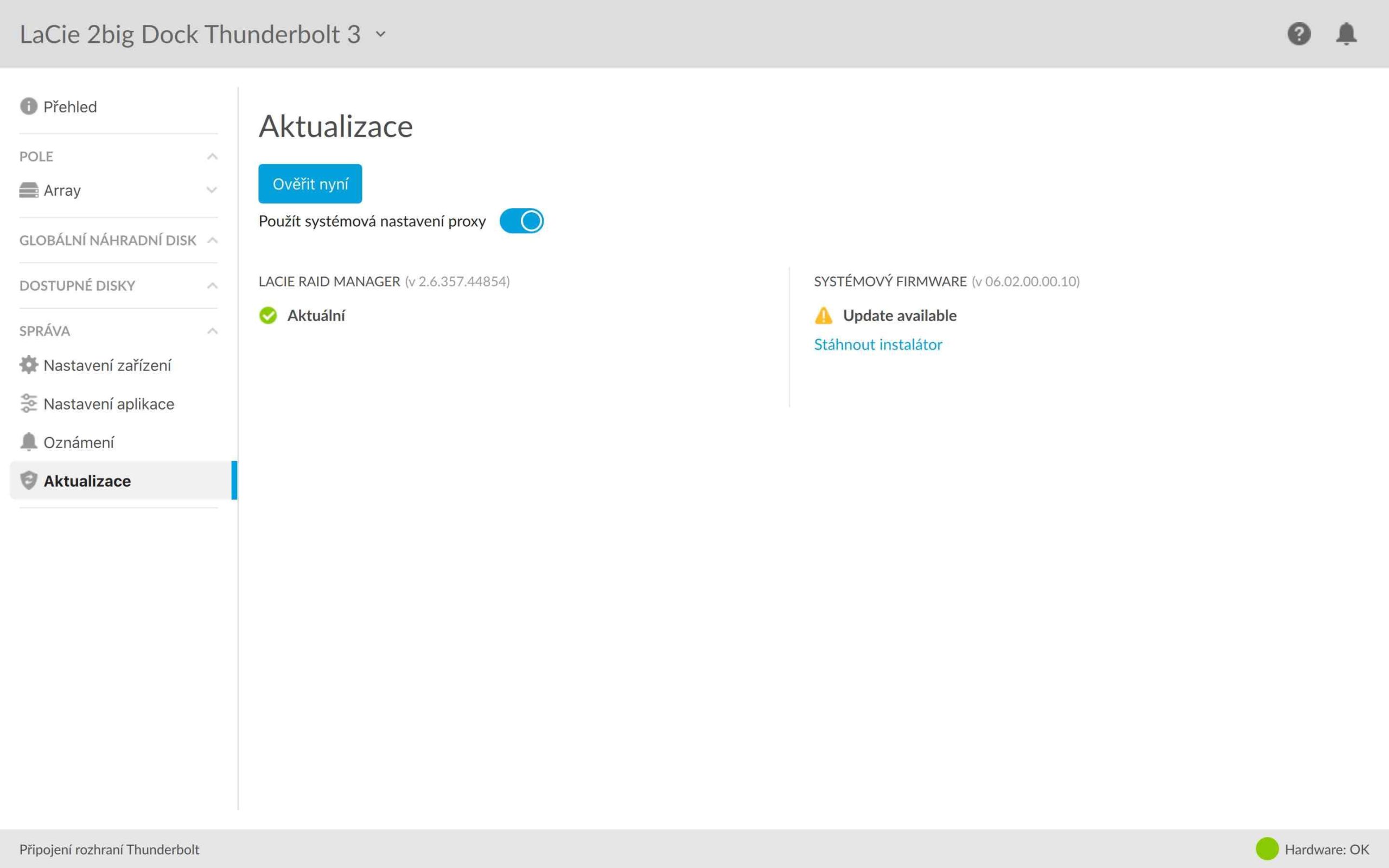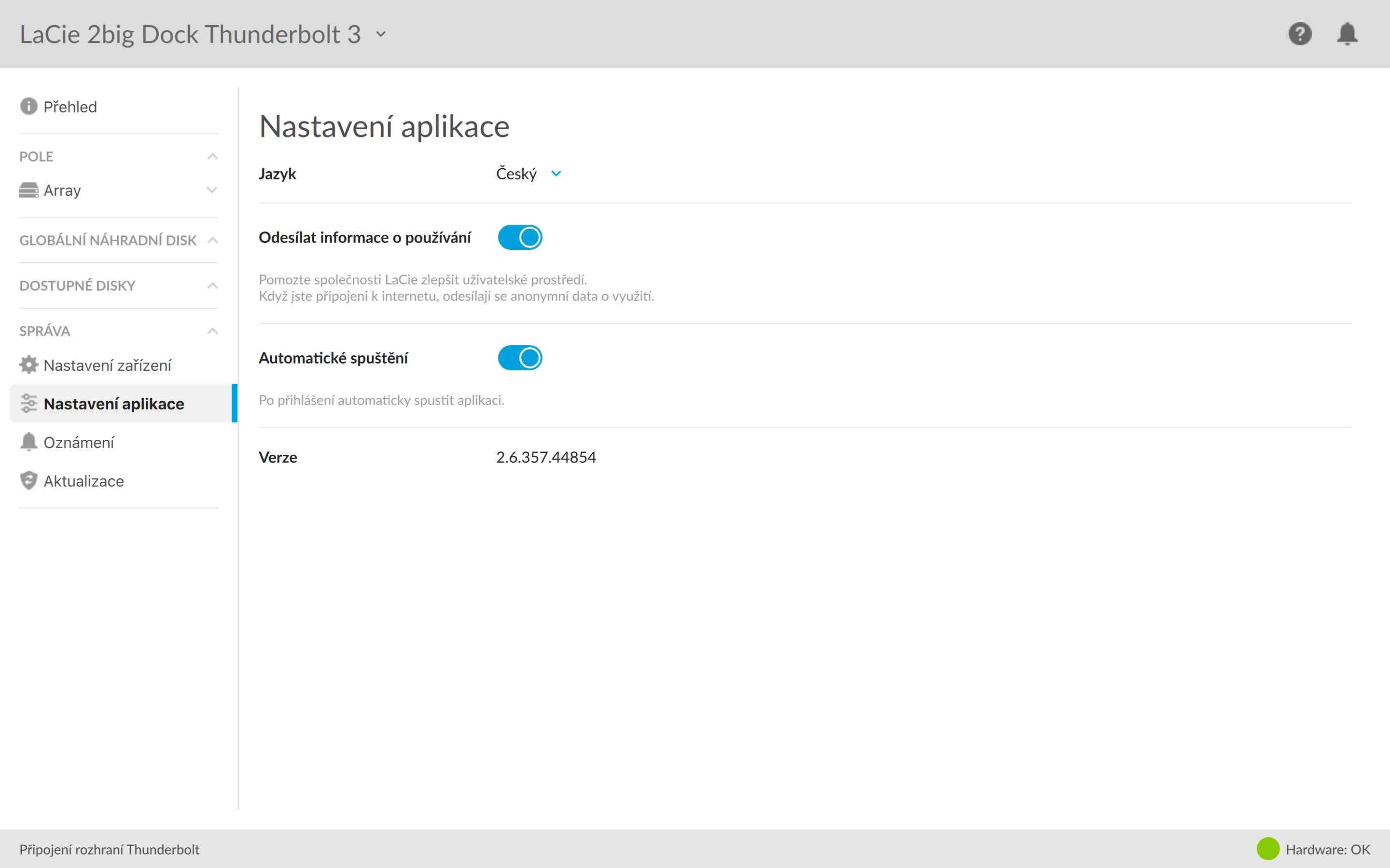 Konfigurace RAID režimů se provádí skrze aplikaci LaCie RAID Manager, která je volně dostupná na macOS i Windows. Samotná správa je jednoduchá a zvládne ji i méně zkušený uživatel. Kromě toho lze skrze aplikaci aktualizovat firmware zařízení nebo si o něm zobrazit většinu informací. Dostupná jsou i oznámení, která si můžete nechat zasílat na e-mail a mít tak přehled, kdyby se s úložištěm cokoli dělo v době vaší nepřítomnosti.