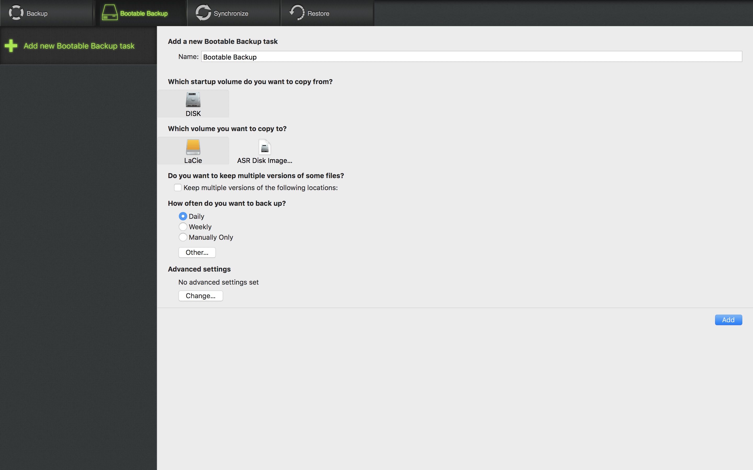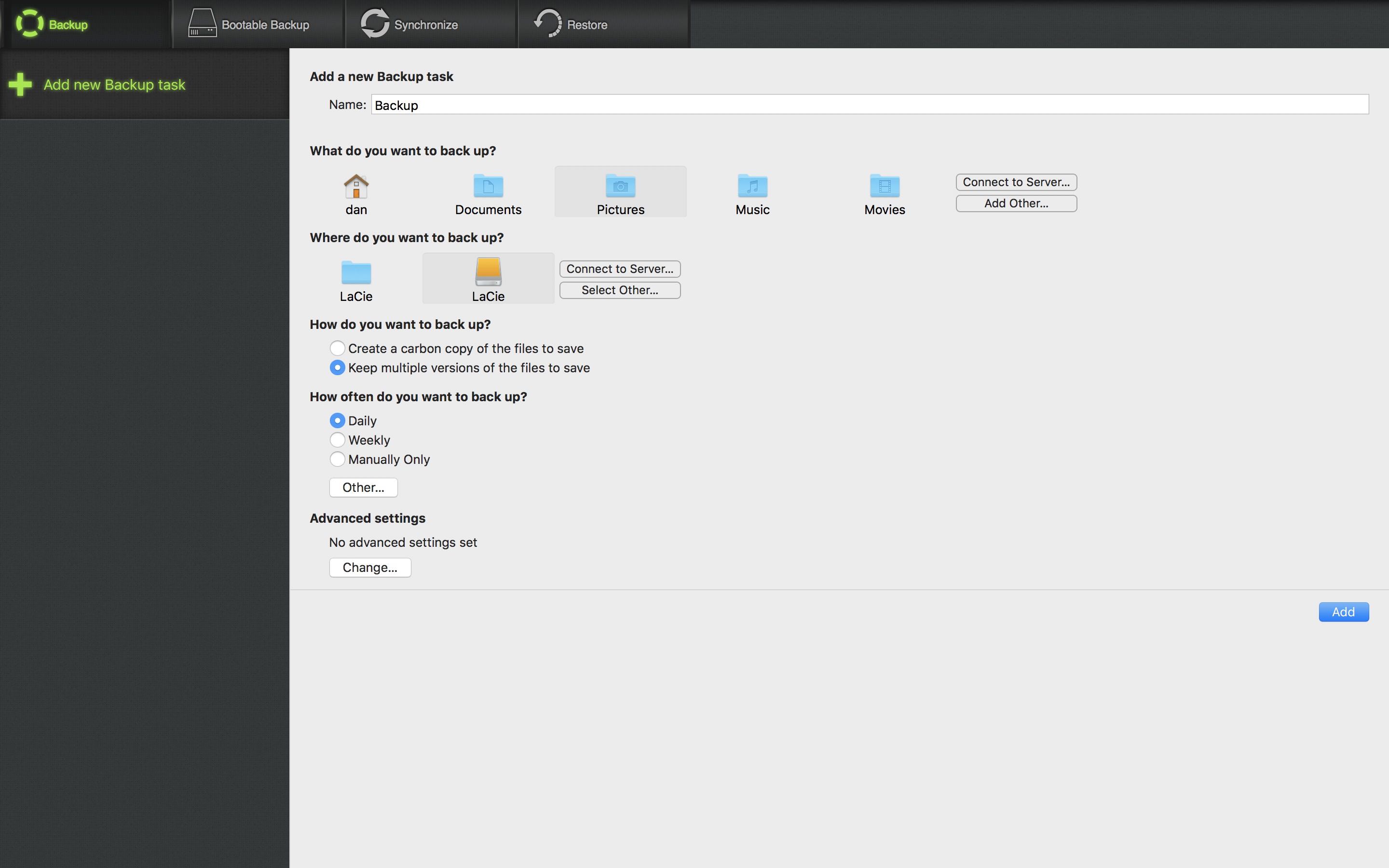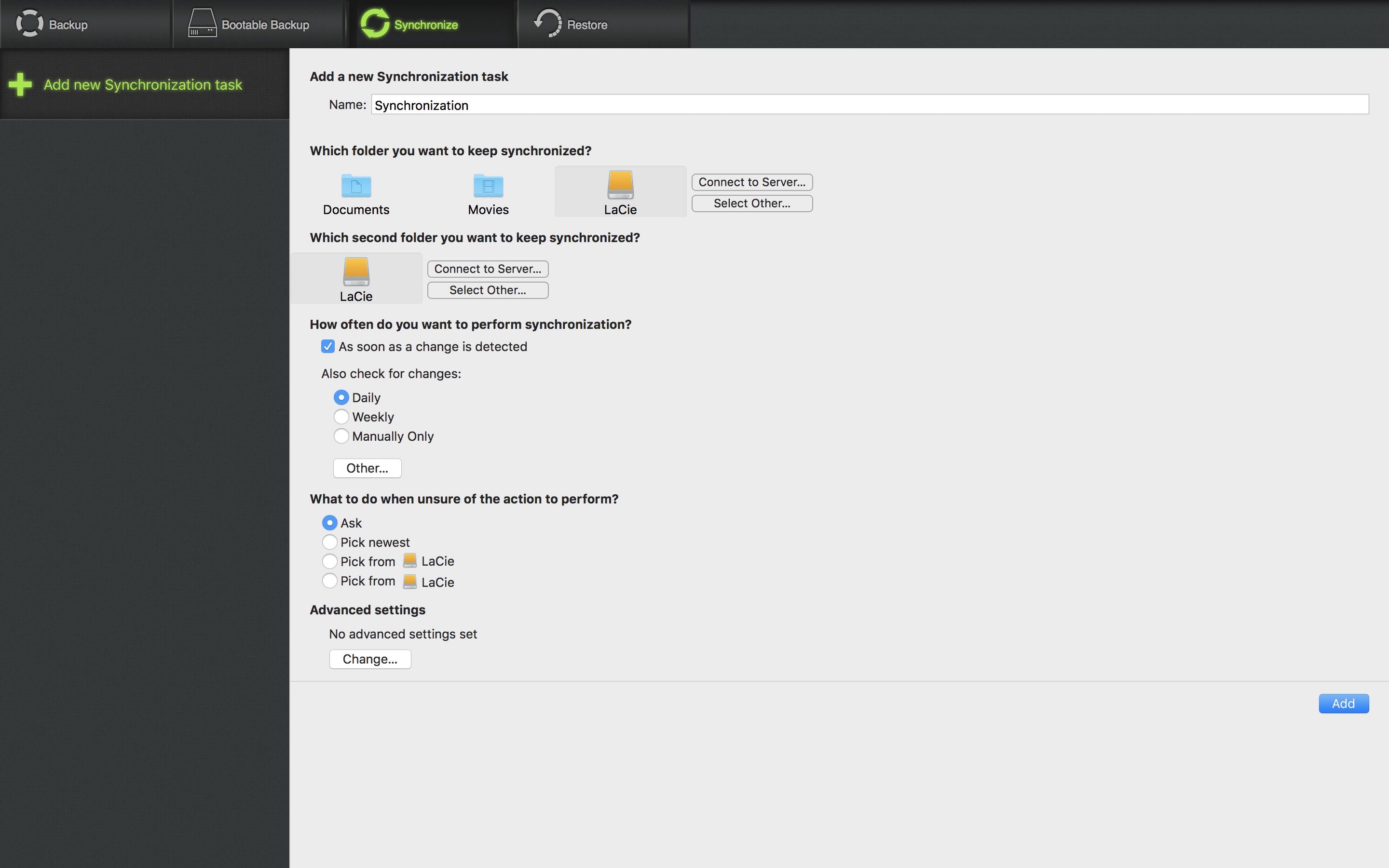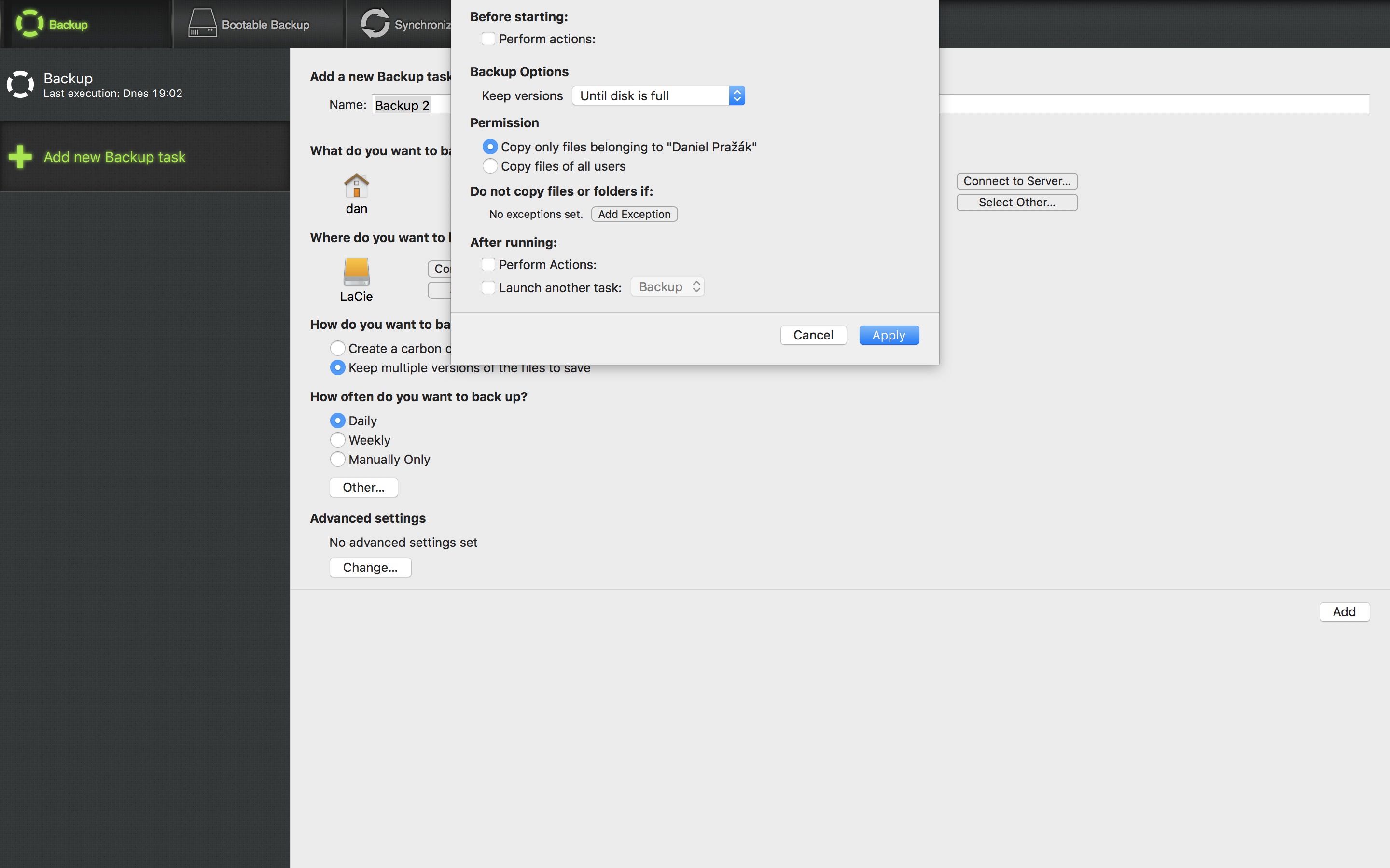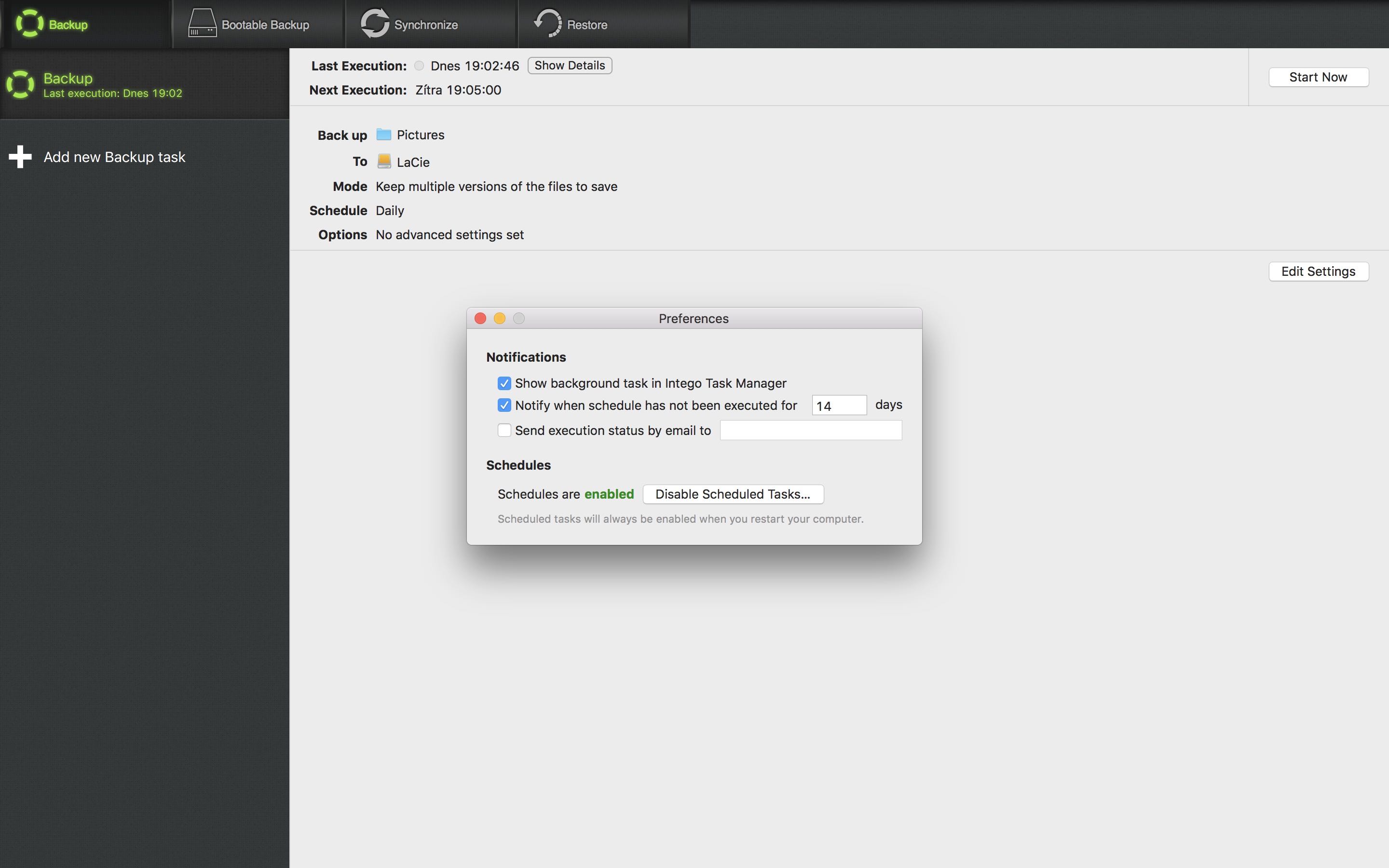 Druhou užitečnou aplikací pro LaCie 2big je Intego Backup Manager, skrze kterou může uživatel provádět zálohy. Aplikace umožňuje zálohovat buďto jen konkrétní složky nebo rovnou celý disk a vytvořit tak rovnou bootovací zálohu. Nastavit si můžete frekvenci záloh, různé podmínky i výjimky. Manager také poskytuje funkci, kdy lze nastavit synchronizaci jednotlivých složek či celých disků – například složka Dokumenty na interním disku v MacBooku bude udržovat svou totožnost se stejnou složkou na externím úložišti. Na závěr pak pochopitelně nechybí ani funkce pro obnovu zálohovaných dat. Intego Backup Manager si může každý vyzkoušet v 30denní trial verzi, kdy jsou dostupné všechny jeho funkce. V balení LaCie 2big pak naleznete sériové číslo pro aktivaci. Po majitele PC s Windows je připraven obdobný software zvaný Genie Backup Manager Pro.