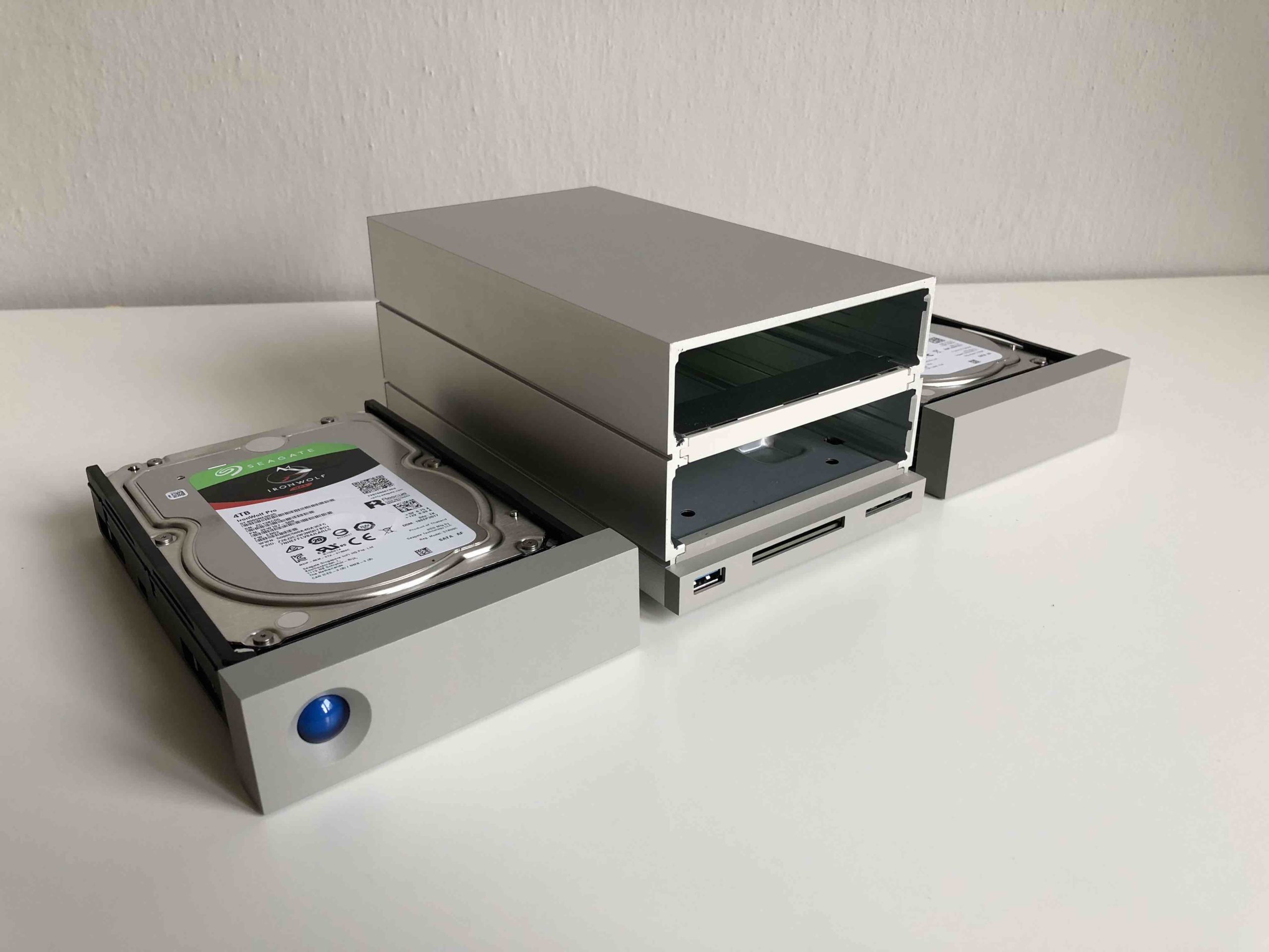 Už na první pohled působí LaCie 2big jako zařízení šité na míru především náročnějším uživatelům. Jedná se totiž o externí datové úložiště se dvěma pozicemi pro 3,5″ disky. V mé konfiguraci je použita dvojice HDD Seagate IronWolf se 7200 otáčkami za minutu a kapacitou 4 TB, v součtu mi tedy úložiště nabízí 8 TB. Pozice je však možné osadit i většími disky, kdy ve výsledku lze dosáhnout až na 20 TB.