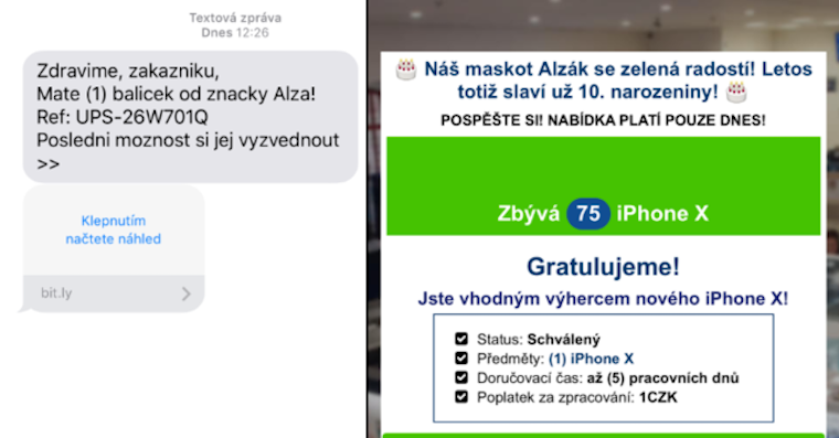 “Vyhráli jste iPhone X od společnosti Alza.cz jako dárek – stačí zaplatit korunu a balíček si vyzvednout,” zní lákavá SMS. Ovšem jedná se o podvod, přičemž namísto telefonu za 30 000 korun přijdete o peníze. Jestliže totiž naletíte a zadáte číslo platební karty pro úhradu jedné koruny, dáváte tím přístup ke svým penězům podvodníkům.