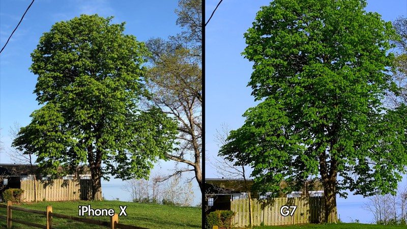 Oproti LG G7 ThinQ nabízí iPhone X pouze 12megapixelový fotoaparát, jehož širokoúhlý objektiv má clonu f/1.8 a teleobjektiv f/2.4. Zařízení LG G7 ThinQ dokáže zachytit širší záběry na šířku a neumí tak dokonalé portréty zblízka jako iPhone X. Sice aplikace fotoaparátu zahrnuje efekt ve stylu portrétního režimu, nicméně rozostření pozadí se provádí pouze softwarem, nikoliv technologií objektivu.