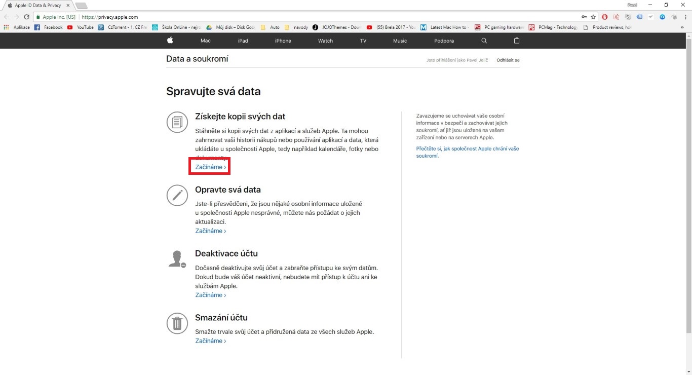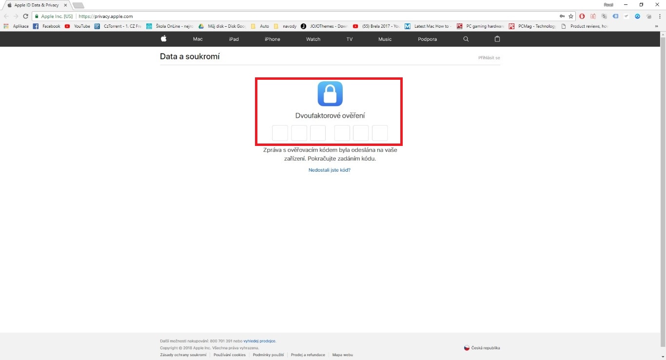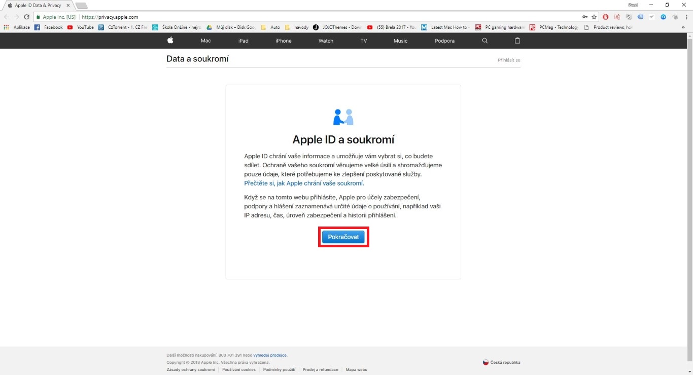 Přejdeme na stránku privacy.apple.com. Přihlásíme se pomocí našeho Apple ID a v případě, že máte aktivované dvoufaktorové ověření, zadáme kód z jednoho z našich zařízení. Po ověření se nám zobrazí uvítací obrazovka, na které stiskneme tlačítko Pokračovat. Nyní máme čtyři možnosti na výběr (jak už jsem zmínil v úvodu). Jedná se o možnosti: