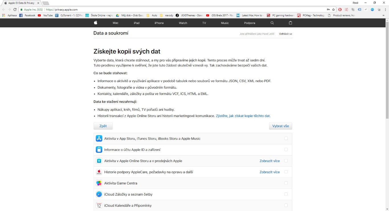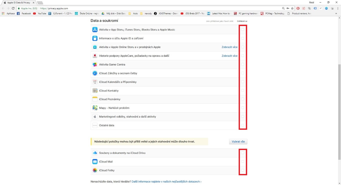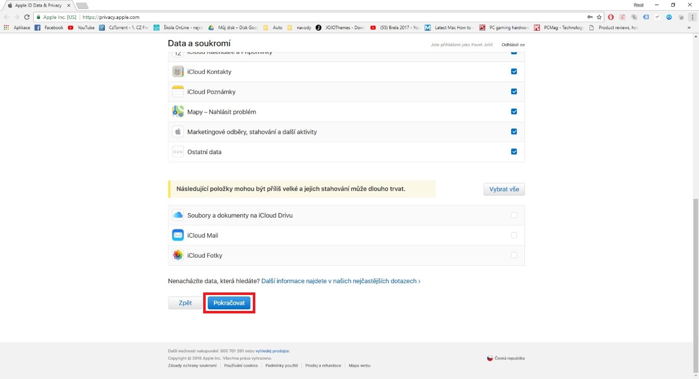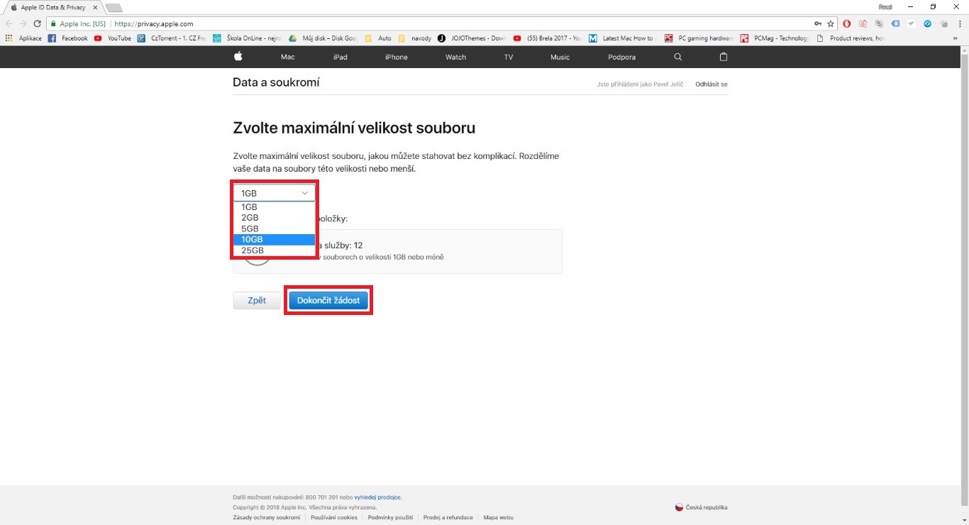 Nás momentálně v tomto článku zajímá možnost Získejte kopii svých dat. Abychom začali, stiskneme na modrý text Začínáme pod popisem možnosti. Na nové obrazovce si můžeme v úvodu přečíst základní informace o tom, jaká data se budou a nebudou stahovat. Poté už jen stačí jednoduše označit, která data chceme stáhnout. Ve spodní části okna se nachází možnosti, které můžou být příliš velké a jejich stahování může trvat dlouho – jedná se o data uložená na iCloud Drive, Mail a Fotky. Poté, co si zvolíme, co chceme stáhnout, klikneme na konci stránky na tlačítko Pokračovat. Nyní se dostáváme k poslednímu kroku, a to zvolení si maximální velikosti souborů, které se stáhnou. Pokud si zvolíme, že chceme mít maximální velikost souborů například 10 GB a naše data budou mít dohromady 50 GB, stáhne se nám 5 souborů o velikosti 10 GB. Poté už stačí pouze stisknout tlačítko Dokončit žádost a vyčkat.