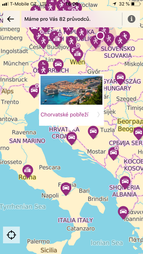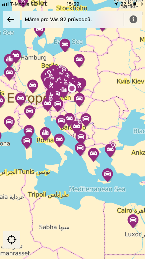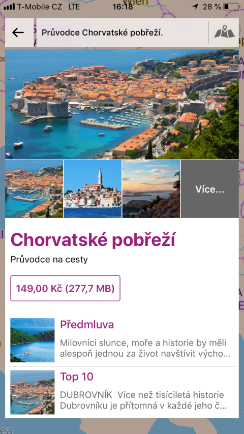 Tato sekce v menu je opravdu zajímavá. V současné době, kdy jsem tuto recenzi psal, bylo pro celý svět k dispozici 82 průvodců. Ty se dělí na 3 skupiny – na turistické průvodce, cykloturistické průvodce a průvodce klasické, tzn. například když do nějaké destinace jedete autem a rádi byste si něco nastudovali. Pro stažení jakéhokoliv průvodce stačí jednoduše v menu vybrat stejnojmennou položku Průvodci. Poté už jen stačí na mapě vybrat průvodce, který vás zaujme. Klikneme na něj a zobrazí se nám náhled do samotného průvodce. Pokud nás z popisu průvodce zaujme, můžeme si jej za symbolickou cenu zakoupit. Veškeří koupení průvodci se poté zobrazí v menu v sekci Moji průvodci.