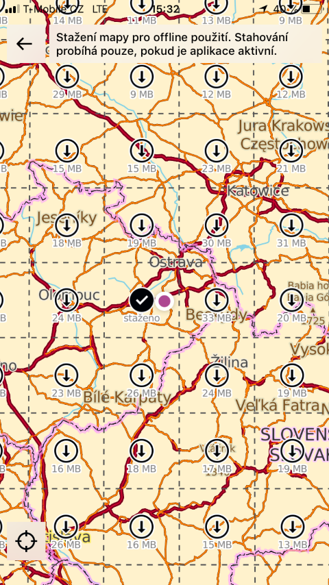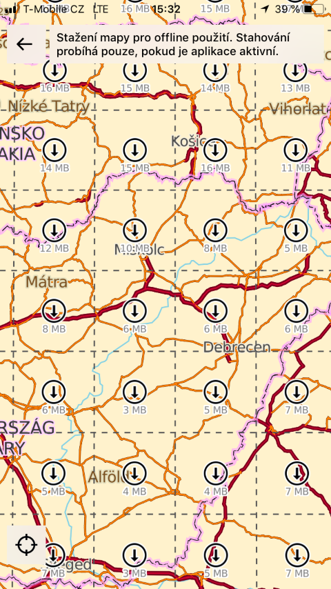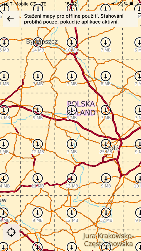 Pokud se rozhodnete stáhnout si mapy do zařízení, stačí si z menu vybrat první možnost – Mapy. Po kliknutí se celá mapa rozdělí na čtverečky a vy jen jednoduše klikáte tam, kterou oblast chcete zrovna stáhnout. Každý čtvereček má poté u sebe napsáno, jestli už je nebo není stažený a samozřejmě u něj nesmí chybět velikost, kterou ve vašem zařízení zabere. Velikost jednoho úseku samozřejmě závisí na tom, kolik v něm je informací – v tomto případě teda stezek pro turisty či cykloturisty.