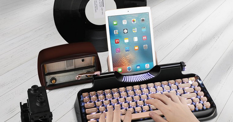 V porovnání s mechanickými klávesnicemi ta od společnosti Rymek zahrnuje několik moderních prvků, například nabízí podsvícené klávesy s možností ovládání jasu. Samotný iPad vložíte do pomyslného zásobníku papíru v horní části mechanické klávesnice.