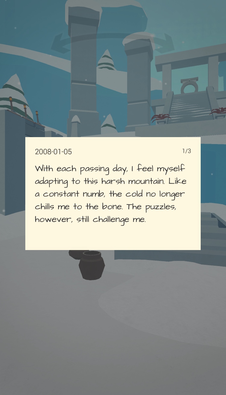 Vašou hlavnou úlohou v hre bude úspešne zvládnuť mechanické hlavolamy, ktoré sa nachádzajú v zasneženom prostredí. Svoju postavu ovládate prostredníctvom jednoduchého poťahovania a stláčania obrazovky. Pohľad z prvej osoby zabezpečuje širokospektrálny záber celej hernej plochy a ovládanie je viac než inštinktívne. V hre síce neoperuje žiadna forma asistencie pre začiatočníkov, no v konečnom dôsledku to ani nie je potrebné. Jednoduché otáčanie vpred a do strán si osvojíte behom niekoľkých sekúnd.