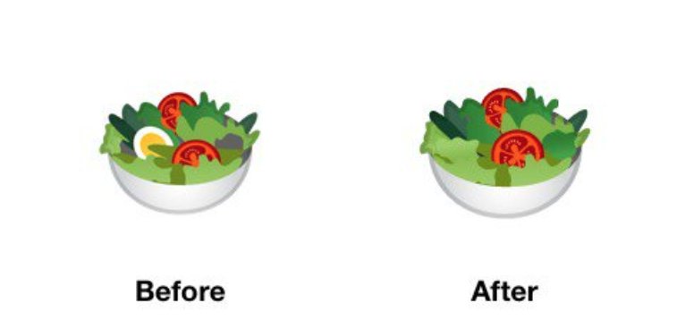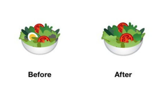 Manažerka UX-ART týmu Googlu uvedla na svém Twitteru, že v připravovaném Androidu P již vejce ze salátu odstranili, takže je nyní absolutně “nezávadný” i pro zprávy veganů. Pravým důvodem však podle manažerky bylo hlavně to, aby tuto emoji přiblížili co nejblíže popisu unicode, ve kterém se hovoří o misce zdravého salátu, která obsahuje salát, rajčata a jiné “salátové předměty” jako například okurku. Těžko však samozřejmě říci, zda je tvrzení manažerky pravdou či zda jen maskuje to, že byl nátlak veganů enormní a proto se rozhodli k přepracování.