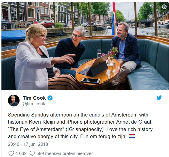I CEO nejhodnotnější společnosti na světě musí občas vypnout. Tim Cook strávil víkend v Amsterdamu, kde, podle svého tweetu, prozkoumával bohatou historii a tvůrčí energii tohoto města. Během pobytu mu dělal společnost historik Koen Klejn a iPhone fotografka Annet de Graaf.