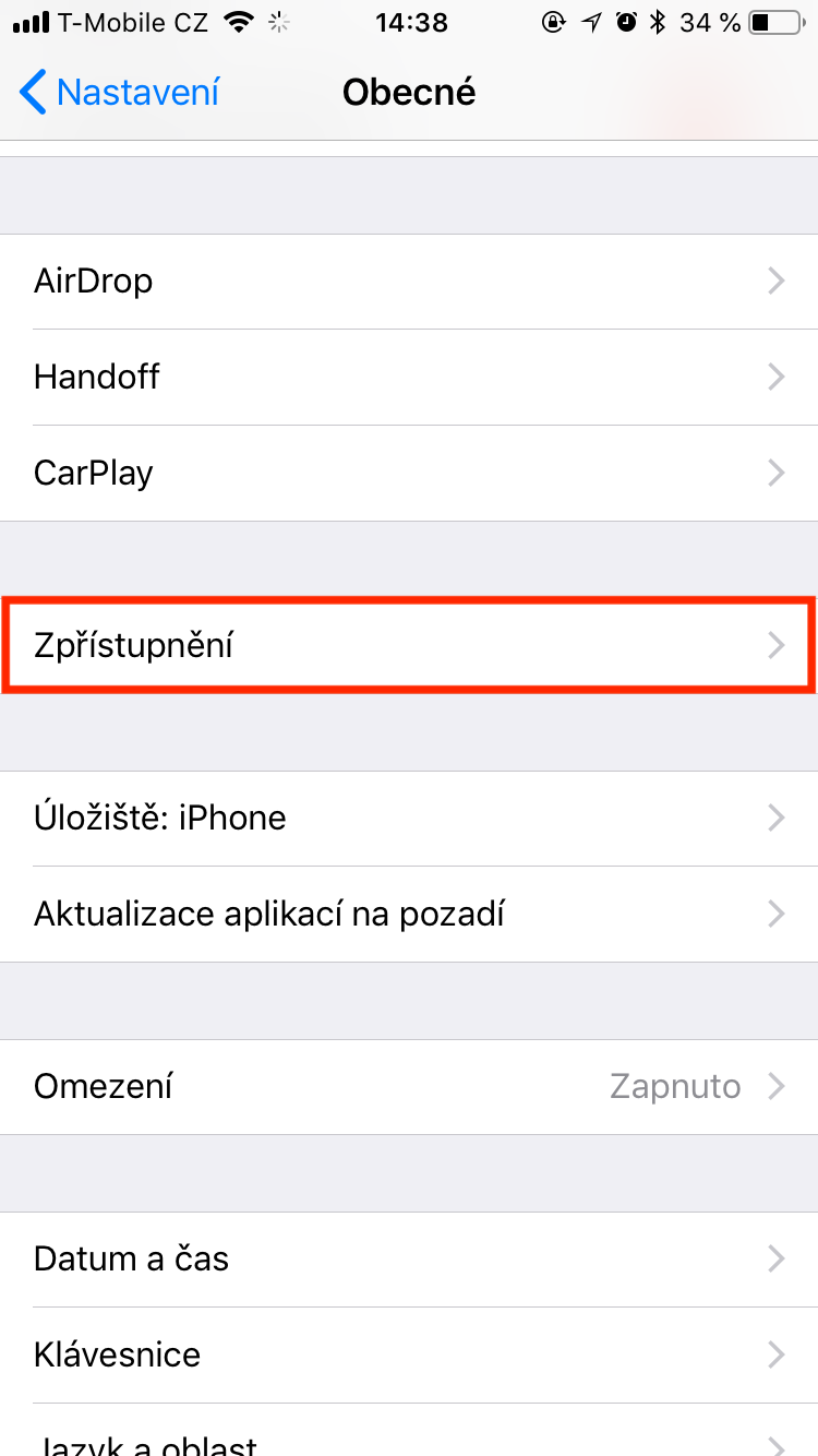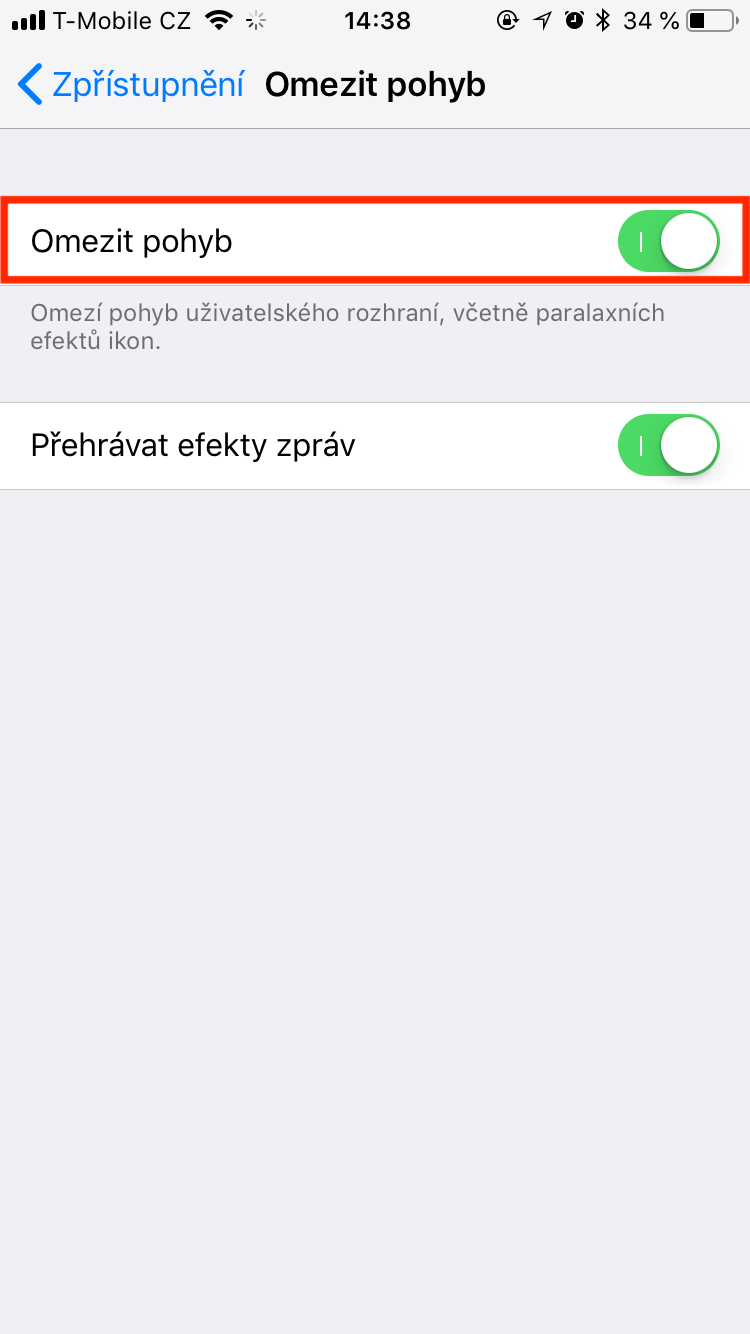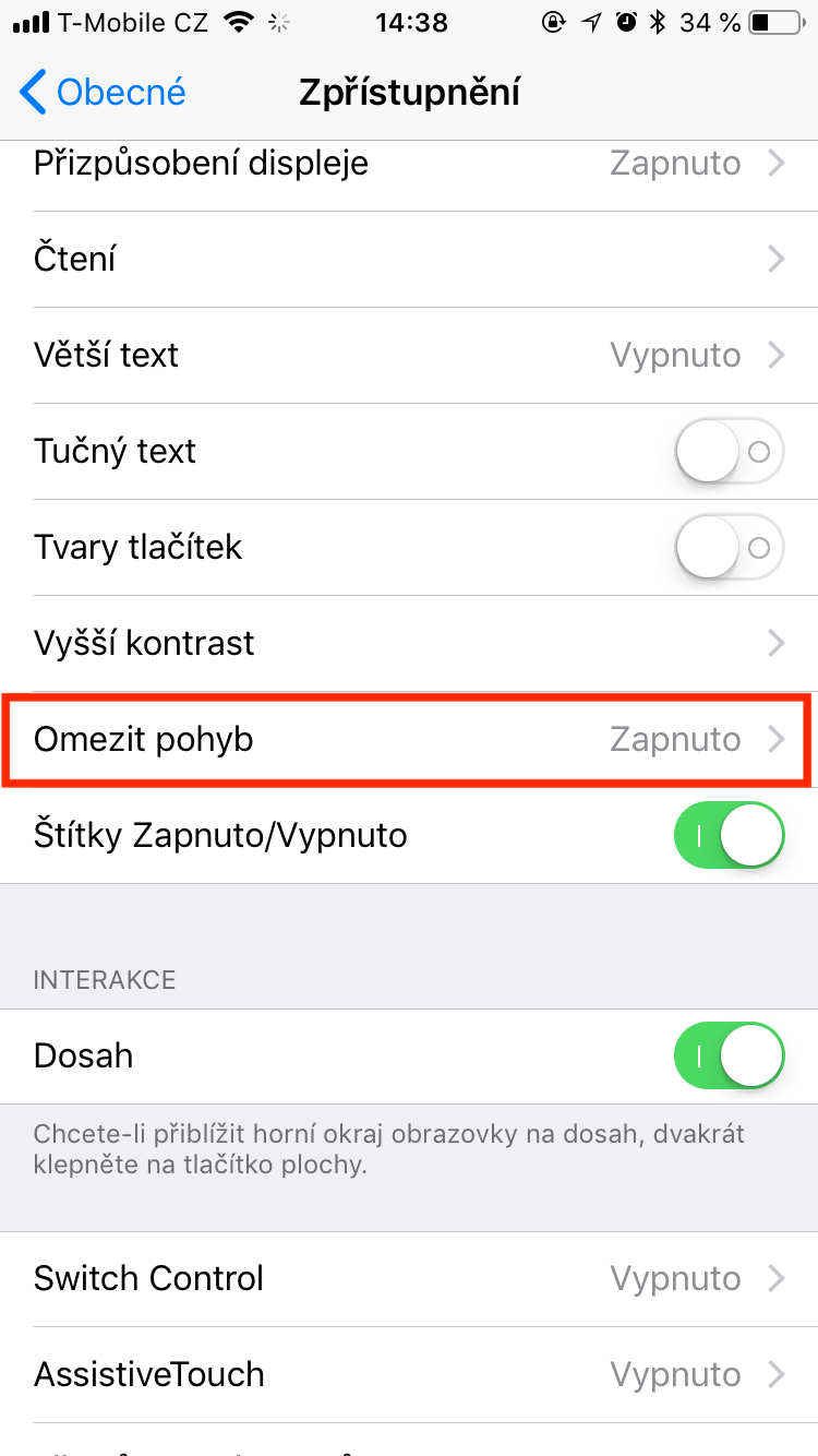 Nejprve je nutné, abyste se na vašem iOS zařízení přesunuli do Nastavení. V nastavení přejdeme do kolonky Obecné a zde rozklikneme možnost Zpřístupnění. Hned v první skupince možností se v dolní části nachází možnost Omezit pohyb, kterou otevřeme. Po rozkliknutí tuto funkci jednoduše pomocí switche aktivujeme.