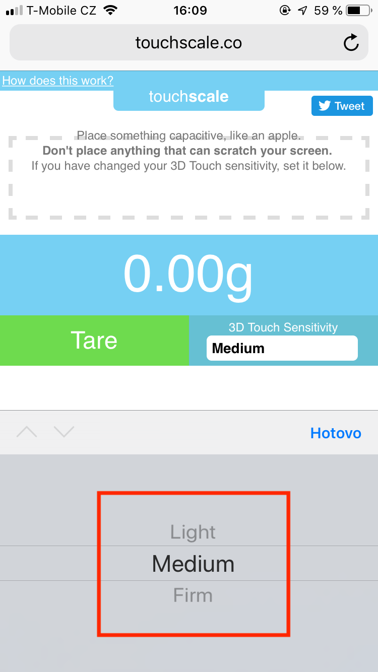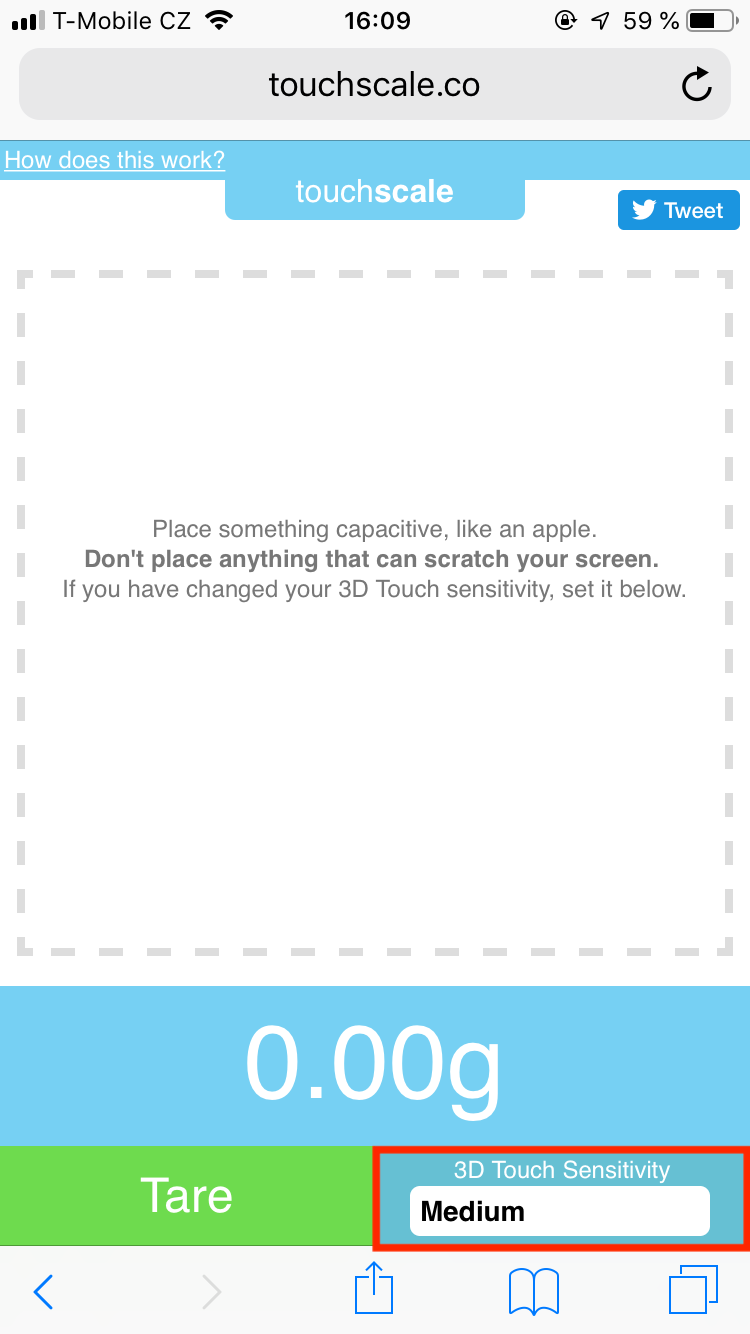 Úplně v prvním kroku musíme přejít na internetovou stránku touchscale.co, na které se aplikace pro vážení nachází. Objeví se velice jednoduchá stránka, z níž většinu plochy zabírá místo, na které můžete položit objekt pro vážení. Nejprve je ale nutné si v pravém dolním rohu nastavit citlivost funkce 3D Touch (vaši citlivost zjistíte v Nastavení -> Obecné -> Zpřístupnění -> 3D Touch). Jakmile si tuto jedinou věc nastavíme, tak už můžeme začít vážit.