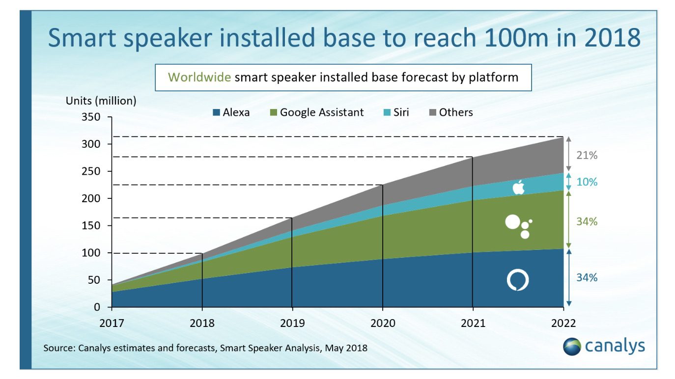 Analytici společnosti Canalys si na trh s inteligentními reproduktory posvítili a pokusili se předpovědět i jeho budoucí vývoj. Pokud se však jejich prognóza skutečně vyplní, Apple z ní mít rozhodně radost nebude. Do konce letošního roku bude čítat základna inteligentních reproduktorů zhruba 100 milionů jednotek, což je zhruba 150 % nárůst oproti loňskému roku. V roce 2022 se pak základna rozroste na zhruba 315 milionů jednotek, přičemž jejími hlavními vládci bude Amazon a Google.