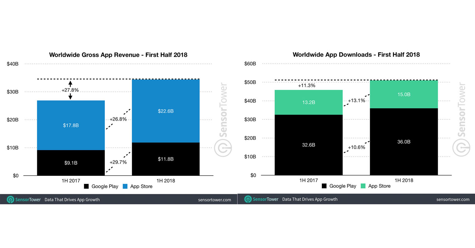 V bitvě o nejlepší obchod s mobilními hrami a aplikacemi má Apple obrovský náskok. Během prvního pololetí letošního roku utratili zákazníci v App Store téměř dvojnásobek toho, co uživatelé Androidu v Google Play. Ale výsledná čísla jsou pozitivní pro obě společnosti, jelikož u obou dochází pravidelně k růstu.
