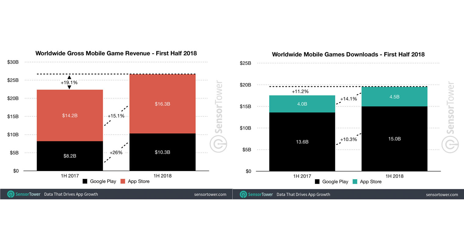 Herní segment je jeden z těch nejdůležitějších, takže se analytici zaměřili i na něj. U App Store vydělali hry přes 16 miliard dolarů (320 miliard korun), což je nárůst o 15 procent. Zisky z Google Play vzrostly o 26 procent, konkrétně na více než 10 miliard dolarů (200 miliard korun). V počtu stažení opět vítězí Google s 15 miliardami stažených her (nárůst o 10 procent), zatímco z App Store si uživatelé stáhli pouze 4.5 miliard her (nárůst o 14 procent).