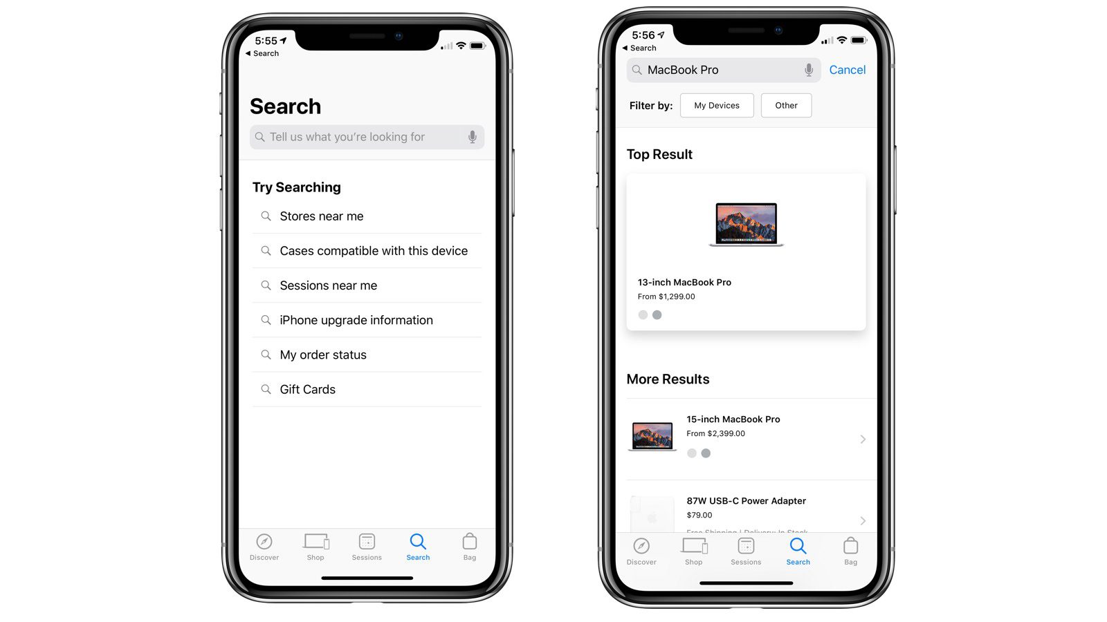 Apple aktualizoval svou aplikaci Apple Store. Verze 5.1 přináší vylepšené vyhledávací rozhraní, které se nyní podobá aplikacím App Store a iTunes Store. Vyhledávací rozhraní nyní upozorňuje na trendy ve vyhledávání. Dále můžete kliknout na ikonku mikrofonu vedle vyhledávací lišty, a tak můžete nadiktovat to, co hledáte. Potom byla updatovaná stránka s výsledky vyhledávání a obsahuje nové rozhraní založené na kartě usnadňující řazení výsledků. Vyhledávání má tedy rozšířený design a je vybaveno technologií rozpoznávání řeči pro lepší výsledky vyhledávání. Nikdy nebylo snadnější najít produkty, obchody, relace a další.