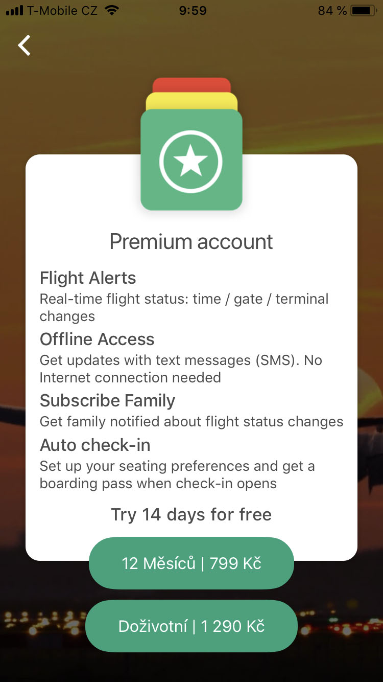 V základu je aplikace zdarma, nabízí však i prémiové předplatné. To vám za 799 Kč ročně (případně 1.290 kč na „doživotí“) nabídne informace o vašem letu v reálném čase. Čas odletu i nástupu do letadla, terminál a bránu, případné změny. Dále je součástí placené verze i již zmíněna offline funkce, kdy vám upozornění chodí jako SMS zprávy. Zajímavě zde zní i možnost automatického check-inu. V něm si navolíte vaše preferovaná místa a aplikace vše zařídí za vás, poté vám již přijdou samotné letenky s konkrétními místy. Nemusíte tak hlídat přesný čas spuštění check-inu, abyste pro sebe zabrali ta nejlepší místa, od toho je tu App in the Air.