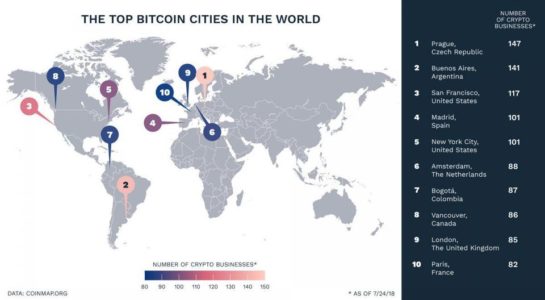Podle statistiky služby Coinmap, která zmapovala obchodníky akceptující bitcoiny, se Praha stala jedničkou v žebříčku měst, v nichž je možné platit kybernetickou měnou. Server Forbes.com podotkl, že v české metropoli je momentálně 147 obchodů, v nichž se dá platit bitcoiny, přičemž v čísle nejsou zahrnuti obchodníci z okrajových lokalit hlavního města. Praha tedy obsadila první místo, hned za ní se umístilo Buenos Aires (141 míst), San Francisco (117 míst), Madrid (101 míst) a New York City (101 míst). Kompletní seznam můžete zhlédnout na obrázku níže: