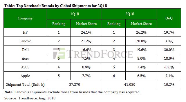 Podle tabulky, kterou TrendForce zveřejnilo, je jasně patrné, že z šestice největších výrobců počítačů zaznamenaly mezičtvrtletní propad pouze tři společnosti – Asus, Lenovo a Apple. Naopak konkurenci v čele s HP se velmi dařilo.