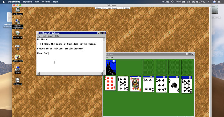 Aplikaci, pomocí které si můžete užít starý Windows 95, vytvořil Felix Rieseberg. Windows 95 si tak můžete velice jednoduše spustit jak na macOS, tak i na klasických Windowsech či Linuxu. Samozřejmě se nejedná o plnohodnotně funkční operační systém, avšak pokud byste si chtěli zahrát Hledání min, či si něco nakreslit v Malování, tak samozřejmě můžete. Bohužel ale tady možnosti spíše končí – například Internet Explorer už si nezapnete.