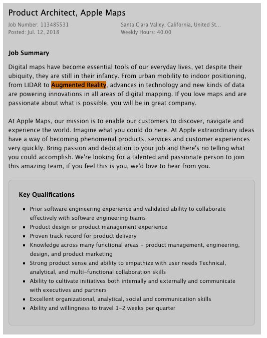 Server Thinknum totiž zjistil, že spojení „AR Application“ se objevuje v čím dál více nabídkách pracovních pozic právě pro Apple. Už 11. srpna se objevilo na oficiálních stránkách společnosti několik nabídek na pozice týkající se AR (AR = rozšířená realita), jak můžete vidět v galerii. Vypadá to tedy, že Apple skládá nový tým, který se bude zabývat přímo touto technologií. Navíc v jedné nabídce, která je primárně zaměřena na Apple Mapy, je také zmínka o znalosti rozšířené reality, a tak se začíná spekulovat o možnosti zapojení této technologie i do map, které Apple momentálně přepracovává.