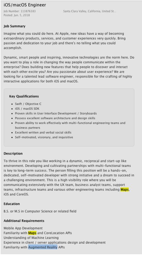 Další nabídka na pozici inženýra iOS/macOS z června také prozrazuje zajímavé informace. Vypadá to, že v tomto případě se jedná o celkem obecný popis pracovní pozice, která se netýká nějakého konkrétního týmu. Apple tím chce zřejmě nalákat co nejšikovnější potenciální pracovníky se znalostí architektury pro iOS a macOS a mají kreativního ducha.  Navíc pod položkou „Další požadavky“ je opět zmíněna „znalost API Map a polohových údajů“, ale také „znalost API augmentované reality“.