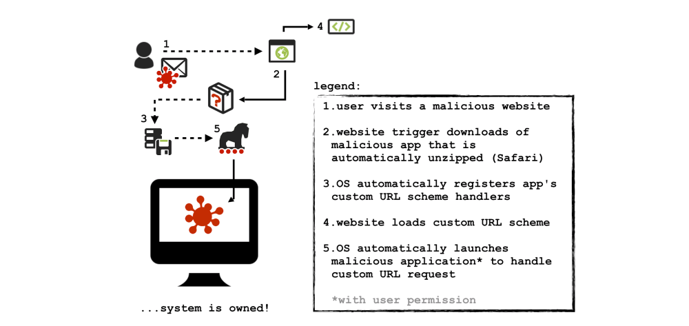 Wardle ve svém příspěvku na blogu vysvětluje, jak skupina útočníků, pokoušejících se cíleně napadnout konkrétní cíl a získat přístup k jeho síti a příslušným datům, může za pomoci zmíněných schémat na dálku zasáhnout uživatele macOS. Pokud v macOS kliknete například na dokument ve formátu PDF, začne ho automaticky zpracovávat aplikace Náhled. Pokud v rámci webového prohlížeče kliknete na odkaz ke konkrétní aplikaci, spustí se vám Mac App Store, odkud si aplikaci můžete stáhnout.