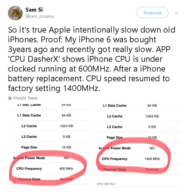 Přesně tak, ale co je to platné – když komentář nad tím vychvaluje záměrné zpomalování a navíc píše cosi nesmyslného o prodloužení životnosti IP. Samozřejmě nejde jen o IP, týká se to všech ios zařízení včetně aWatch, kdy pomalu nejde pořádně spustit aplikace cvičení u series 2.