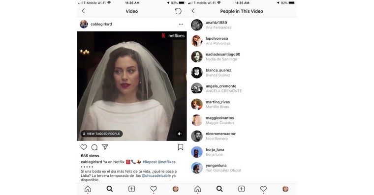 Instagram testuje funkci, která umožní uživatelům označovat přátele ve videích. Pokud se tedy chcete podívat na uživatele označené ve videu, stačí v levém dolním rohu kliknout na ikonku View Tagged People, která vás přesměruje na samostatnou stránku se seznamem všech osob označených ve videu. V současné době se videa nezobrazují na profilech označených uživatelů, jako je tomu u fotek, ovšem to se ještě může změnit, pokud se Instagram rozhodne funkci do aplikace skutečně implementovat.