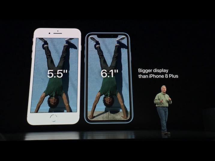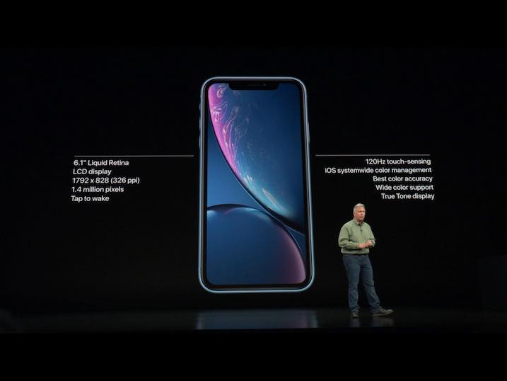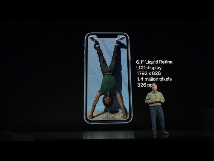 Hlavním rozdílem iPhonu XR a prémiových Xs a Xs Max je rozhodně displej. Ten u XR s úhlopříčkou 6.1“ nabídne pouze technologii LCD nazvanou Liquid Retina s rozlišením 1792×828 a 326 PPI. Kontrastní poměr Apple vůbec neuvedl a oproti iPhonu Xs bude XR odolné pouze podle normy IP67. Odebráním Home tlačítka a příchodem Face ID se i tento model může „pochlubit“ výřezem v horní části obrazovky, který v sobě ukrývá technologii starající se o rozpoznávání obličeje. Samozřejmostí je i schopnost bezdrátového nabíjení, kterou tak disponují všechny aktuální modely iPhonu.