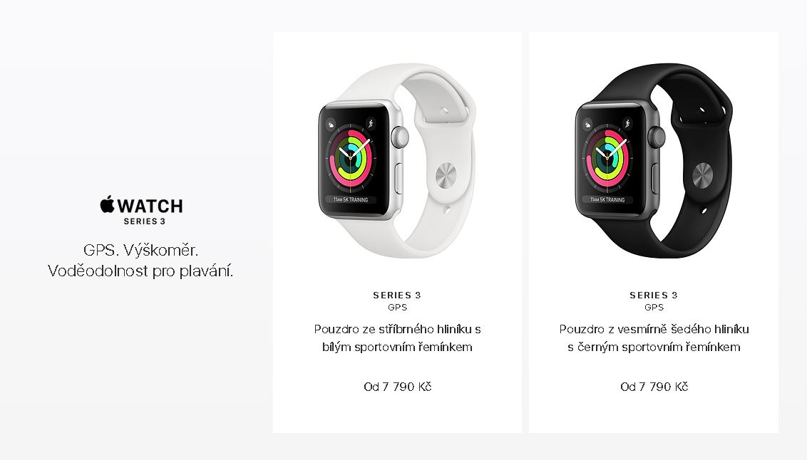 Pod záložkou Apple Watch už nyní kromě Series 4 v klasické či Nike+ verzi zůstává v nabídce pouze Series 3. Stříbrná či černá varianta Sport nebo Nike+ vás bude stát 7.790 Kč pro 38mm velikost a 8.590 Kč pro 42mm. Menší varianta se tím pádem dočkala zlevnění o 2.000 Kč, ta větší o 2.100 Kč.