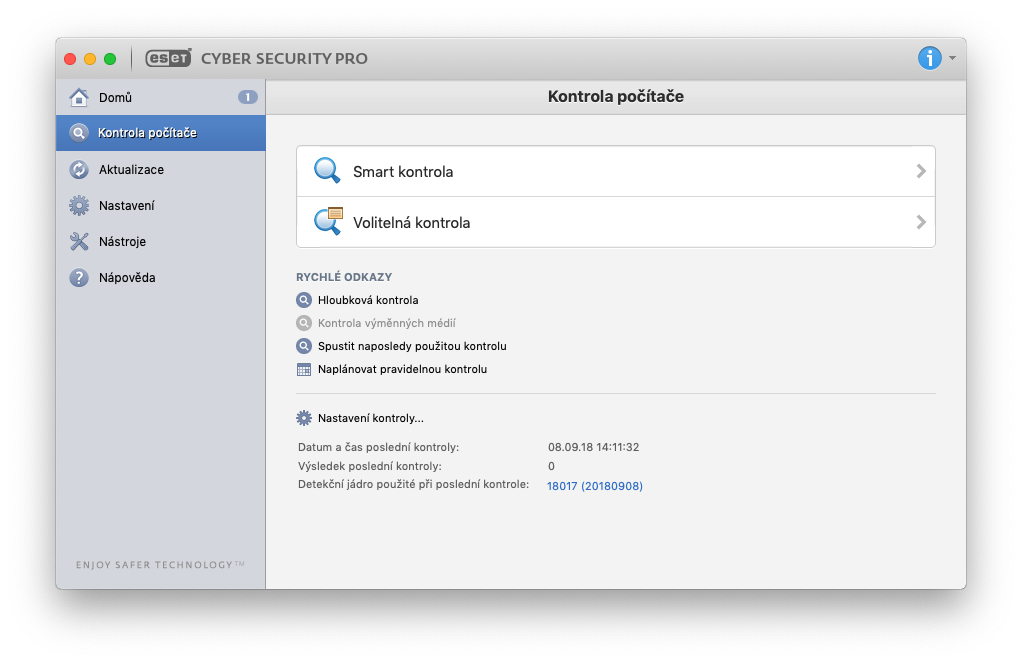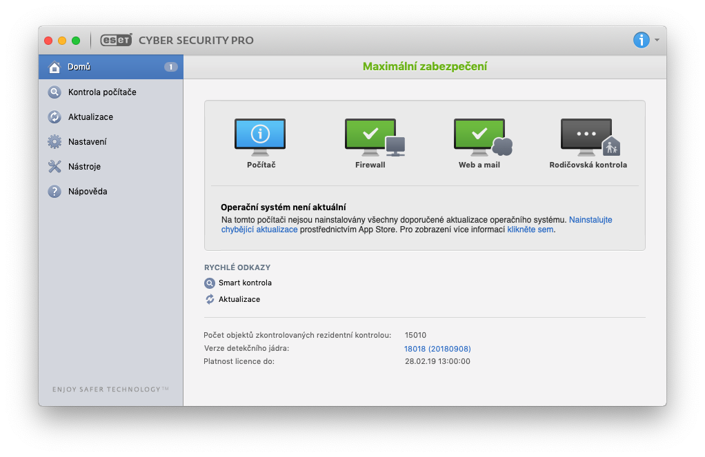 Samotný program samozřejmě běží na pozadí, každopádně pokud do něho budete chtít z nějakého důvodu nahlédnout, tak se s největší pravděpodobností budete často nacházet na kartě Domů, která slouží jako jakýsi „přehled“ toho, že všechny služby fungují tak, jak mají. V mém případě si můžete všimnout, že mě ESET upozorňuje i na to, že můj Mac neběží na poslední verzi macOS a doporučuje mi, abych nainstaloval aktualizaci. Takových oznámení se zde může zobrazit nespočet – pokud je vše v pořádku, tak se ukáže příslušné oznámení a pokud si ESET všimne, že je něco špatně, okamžitě vám to dá vědět právě na domovské kartě. V kartě Domů se poté nachází například Rychlé odkazy, pomocí kterých se můžete, jak už název napovídá, rychle přesunout na ostatní používané karty. V poslední řadě se zde nachází informace o počtu zkontrolovaných objektů, verzi detekčního jádra a platnosti licence.