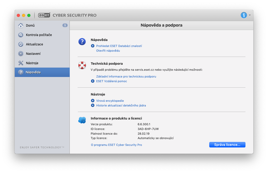 V poslední kolonce Nápověda se už nachází pouze několik odkazů a nápověda, která se vám může hodit tehdy, kdy si s něčím nevíte rady. Pokud ani v nápovědě nenajdete to, co hledáte, tak můžete využít služby Vytvořit dotaz na technickou podporu, kdy se můžete na cokoliv zeptat. V samotné spodní části okna se poté nachází informace o vašem produktu a o licenci – verze, typ a také platnost.