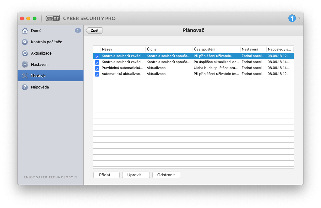 Karta Nástroje obsahuje nástroje, které by se vám mohly hodit. Najdete zde například statistiky hrozeb – před kolika hrozbami vás už ESET ochránil. Mezi další zajímavý nástroj patří například Plánovač, ve kterém si můžete naplánovat vyhledávání aktualizací a kontrolu souborů. V Karanténě se poté nachází všechny soubory, které byly infikovány – pokud jste si vědomi, že v počítače máte potencionálně škodlivý soubor ale potřebujete jej zachovat, tak právě z karantény jej můžete obnovit. Zajímavým nástrojem je také možnost Odeslat soubor k analýze. Pokud například chcete někomu něco poslat a druhá strana má strach, aby byl soubor bez virů, tak pomocí tohoto nástroje si jej můžete nechat analyzovat a vytvořit log o nezávadnosti.