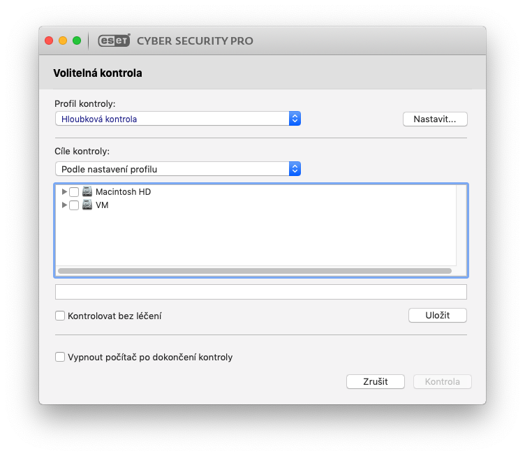 Smart kontrola je taková kontrola, kterou budete používat nejčastěji. Jedná se o jakousi „chytrou“ kontrolu, která si při první kontrole Macu ke každému souboru uloží jeho hash (tzn. kontrolní součet). Pokud se tento hash nezmění, tak se při další provedené Smart kontrole soubor přeskočí, protože je zákonitě nezměněn a tudíž je čistý, bez virů. Každá kontrola je tak rychlejší, neboť se kontrolují jen změněné (nové či upravené) soubory. Smart kontrola je tedy po každém dalším spuštění rychlejší. Poté se zde nachází Volitelná kontrola, ve které máte několik možností na výběr – můžete si vybrat například profil kontroly a pokud máte k dispozici více disků, můžete si zvolit, na kterém z nich se kontrola provede. V neposlední řadě si můžete zvolit možnost kontroly bez léčení (respektive okamžitého smazání souborů) a pokud se chystáte takovou kontrolu provést přes noc, tak si můžete nechat automaticky vypnout počítač po dokončení. Jako poslední možnost je k dispozici Hloubková kontrola. Pamatujete si na hash (kontrolní součet), který jsme si uvedli u Smart kontroly? Tak přesně tento hash hloubková kontrola ignoruje a projede vždy znovu veškeré soubory. Hloubková kontrola trvá tedy déle, ale může najít hrozbu, která nebyla dříve odhalena. Pokud tedy chcete mít klidné spaní s jistotou, že se v počítači nenachází žádné viry či nástrahy, bude se vám Hloubková kontrola určitě hodit.