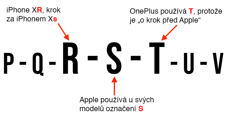 Když se v abecedě podíváme na písmeno S, tak zjistíme, že jej z pravé strany obklopuje písmeno T – tedy písmeno, které používá OnePlus k tomu, aby si lidé mysleli, že jsou dál než Apple, stejně jako ono písmeno, které je oproti S dál. Když se ale podíváme na levou stranu od písmene S, tak zjistíme, že se zde nachází písmeno R. Právě tohle by mohl být ten důvod, proč si Apple vybral označení XR – protože prostě a jednoduše je R o krok před písmenem S, tak stejně, jako je iPhone XR o krok za iPhony Xs.