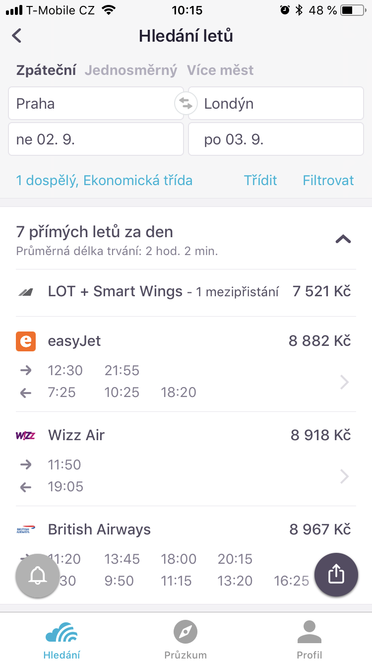 Kiwi je jasným vítězem na poli mobilních aplikací, která vám pomůže především s najitím nejlevnějších letenek, ale i s ubytováním čí půjčením auta. Velkou výhodou je její kompletní česká lokalizace a k tomu i povedený a přehledný design. Hledání letenek je maximálně jednoduché. Nejprve si nastavíte, z jakých letišť můžete odlétat a poté vyhledáte cílovou destinaci. Vyberete datum odlety a v případě zpáteční cesty i příletu zpět a to je vše. Poté si už zobrazené výsledky můžete seřadit podle ceny, trvání cesty, letecké společnosti a mnoha dalších parametrů. Po vybrání toho správného letu můžete přímo skrze aplikaci zakoupit letenku a vše takto vyřídíte za pár minut. Naprosto stejně to funguje i s rezervací pokoje v hotelu, jen se konečná platba provádí přes Booking.com, avšak stále přímo v aplikaci Kiwi.