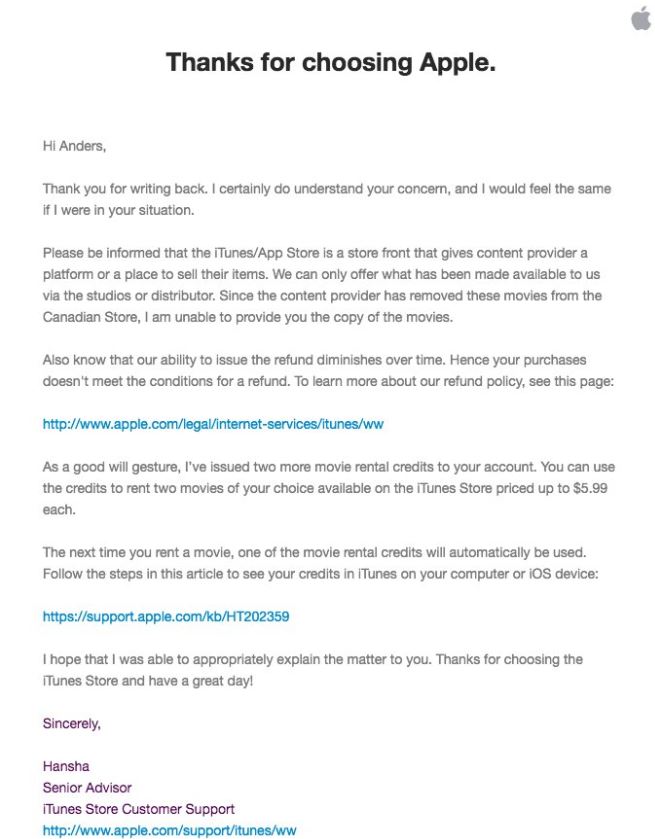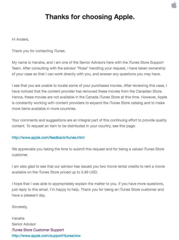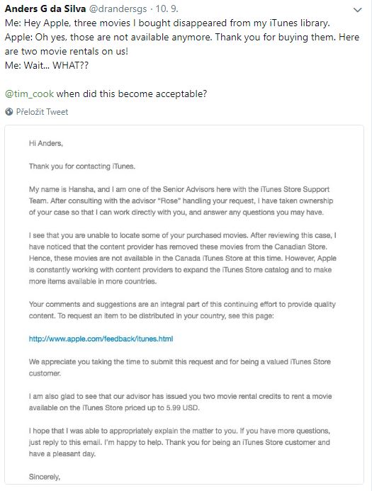 Konkrétně mělo jít o tři filmy, které si zákazník zakoupil a nyní zjistil, že v jeho knihovně nejsou. Napsal tedy na podporu Applu s žádostí o vysvětlení. Toho se mu sice dostalo, ale rozhodně ho nepotěšilo. Applu mu totiž sdělil, že jím zakoupené verze filmů nejsou v kanadském iTunes Storu dostupné. A jako náhradu Appel zákazníkovi nabídl možnost vypůjčit si tři filmy zdarma. Původní filmy měl klasicky zakoupené, takže rozhodně nesouhlasil s kompenzací vypůjčení tří filmů.