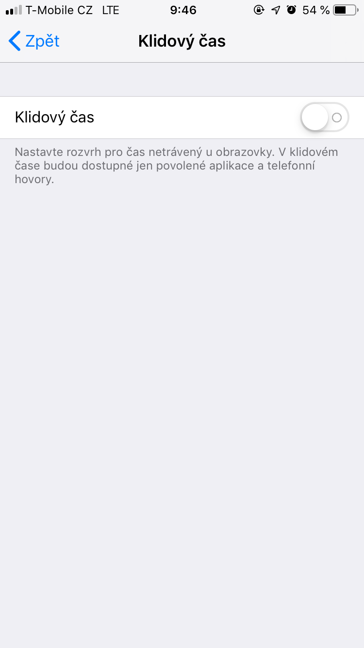 V záložce klidový čas si můžete zvolit čas, mezi kterým budete moct používat jen povolené aplikace. To vás donutí k tomu, abyste ještě před spaním večer opustili veškeré sociální sítě a další aplikace, které mohou narušit váš spánek. Jedná se o vcelku drastickou funkci, avšak komu není rady…